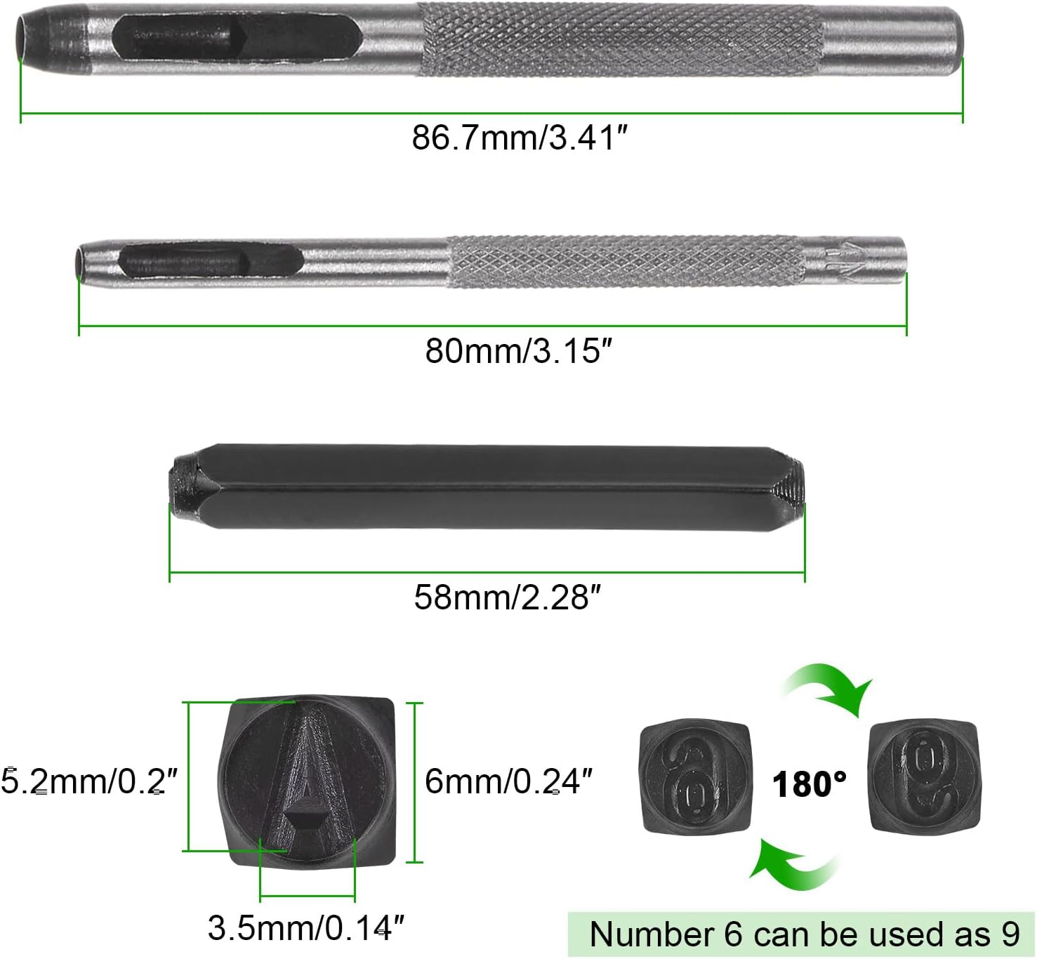 - Metal Stamping Kit - Contains 36pcs of metal punch stamps (26 capital letters from A to Z, numbers from 0 to 8 , an "&" Symbol) sized 5/32" (4mm) of each, and 2 sizes of hole punches.