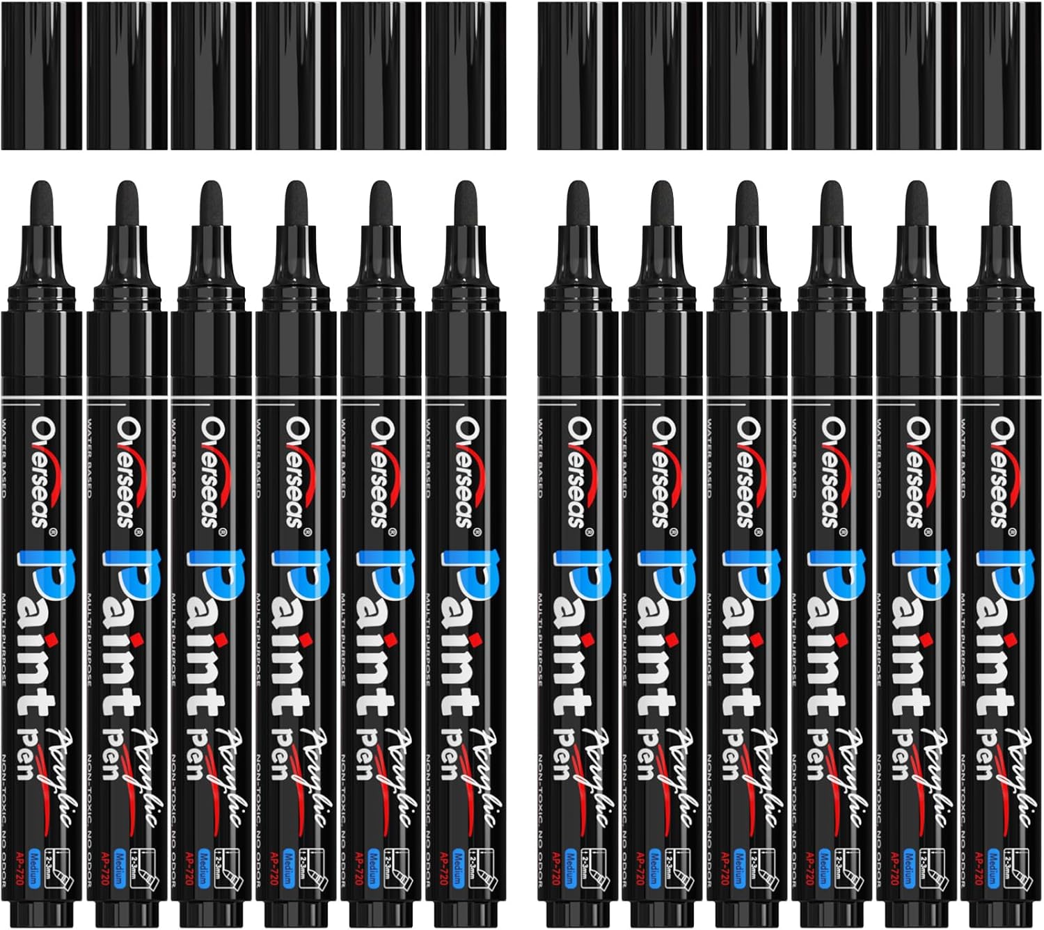 Overseas Black Paint Pens Paint Markers - Permanent Acrylic Markers 12 Pack, Water-Based, Quick Dry, Waterproof Marker Pen for Rock, Wood, Plastic, Metal, Canvas, Glass, Fabric, Mugs. Medium Tip
