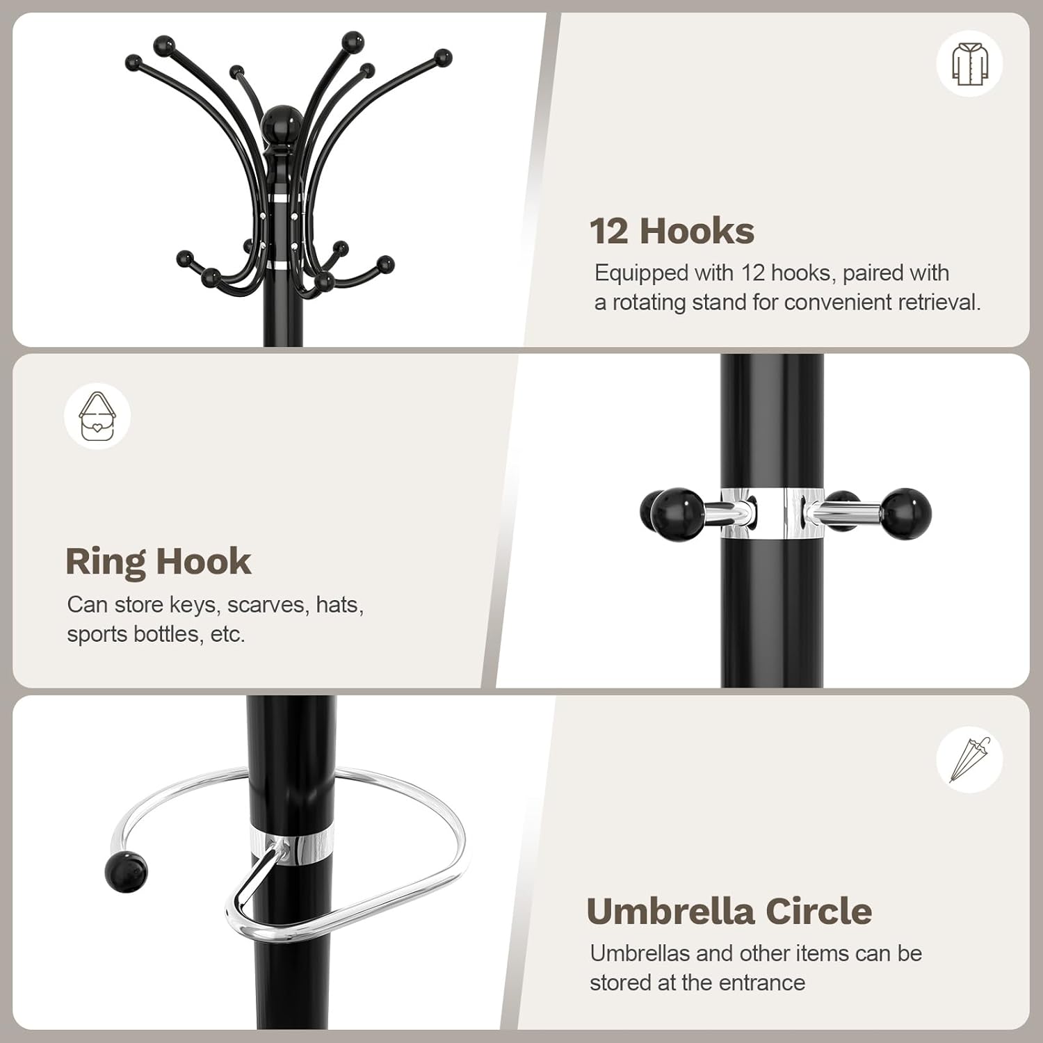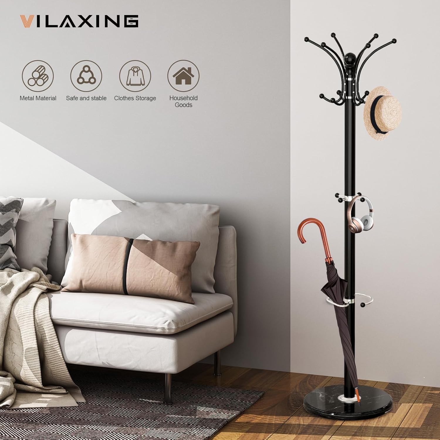 - 16 Hooks and Umbrella Holder: Vilaxing multi-functional coat rack with 16 hooks, and an umbrella holder, which occupies a small area and saves space. Each hook can bear a maximum weight of 15 pounds. The top of the hook has a rounded design to better protect your clothes from damage