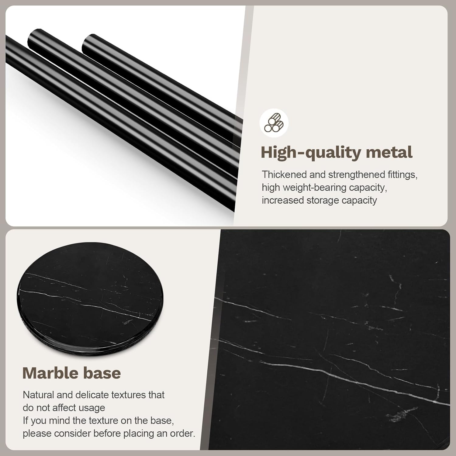 - Marble Base: A stable base is the key of the whole coat tree. Vilaxing coat rack base stand is made of natural marble with smooth surface and clear grain. The material has a high hardness and is sturdy and stable enough to support about 100 pounds of weight. The bottom also comes with a non-slip circular pad to avoid wobbling or tip over