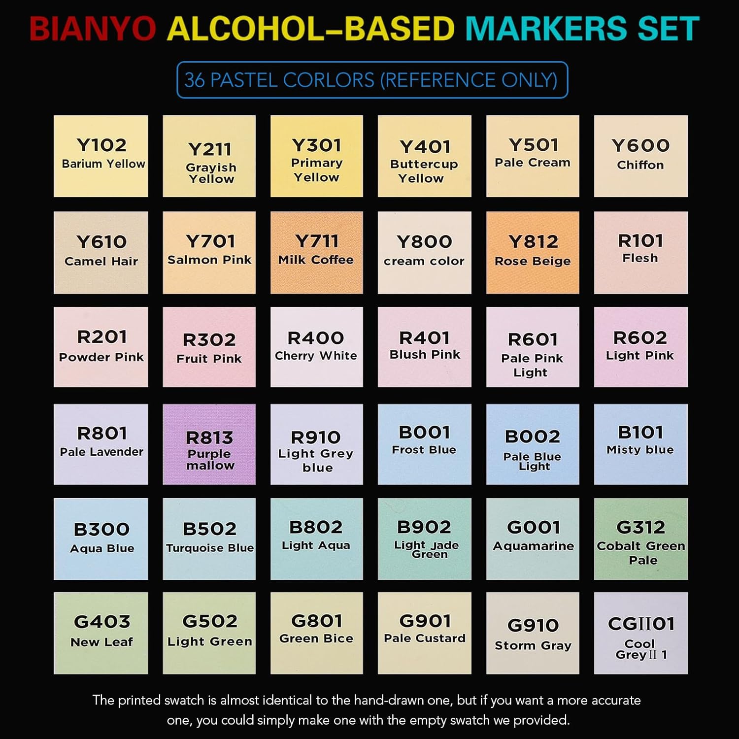 - Vibrant Pastel Palette: Explore 36 luscious pastel shades in our Bianyo Alcohol Markers Set, crafted for artists seeking soft, soothing tones for coloring, sketching, and highlighting projects