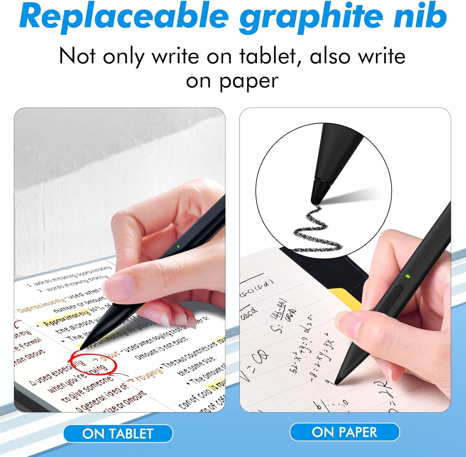 - 4096 Pressure Levels & Graphite Nib 一 Enjoy precise control with 4096 pressure points and smooth, lag-free writing from the 1.0mm tip. The eraser button near your thumb allows quick corrections. The replaceable graphite nib works like a pencil, letting you switch between tablet and paper easily. Offering dual functionality for continuous, effortless creativity.