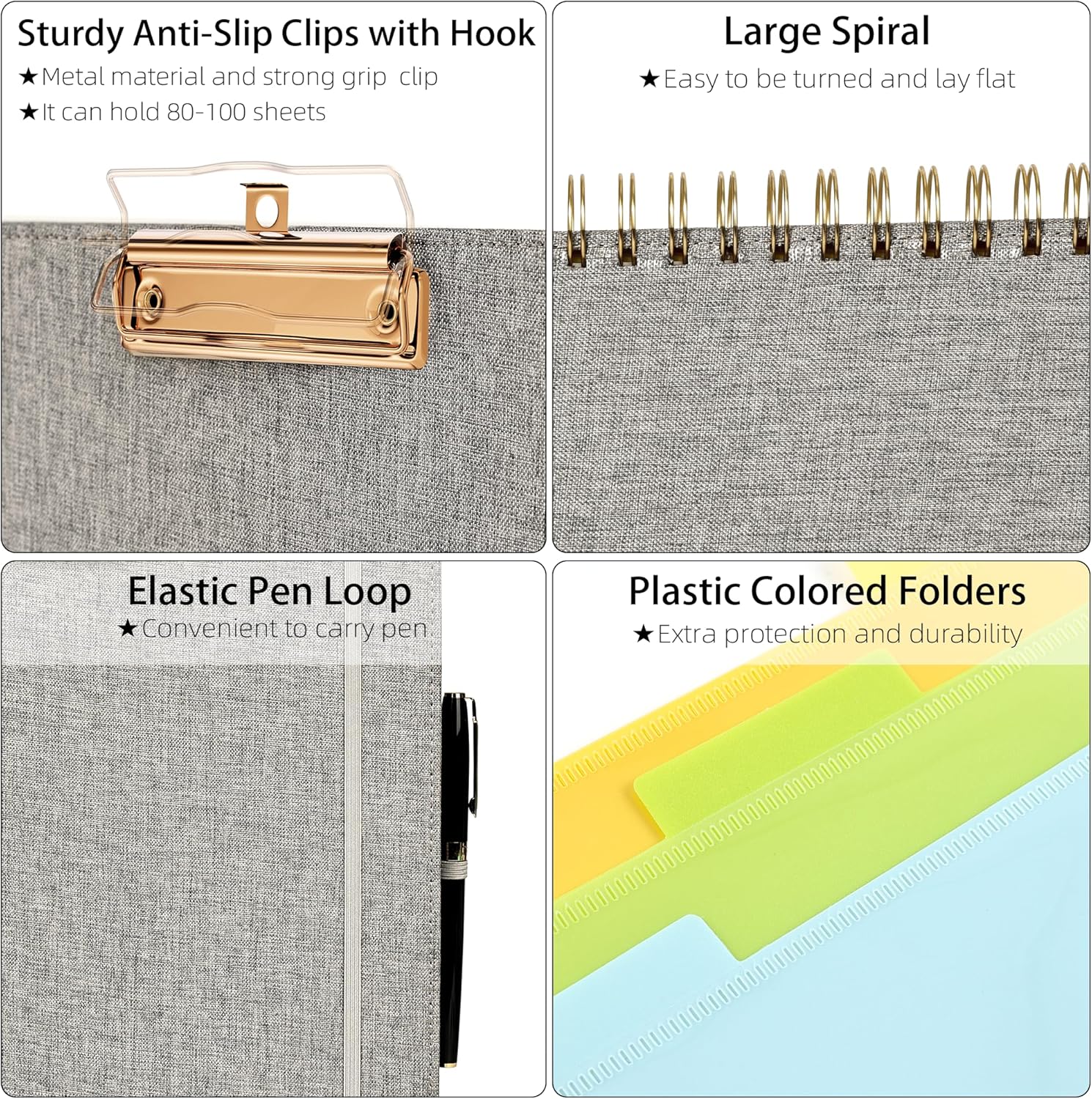 Ospelelf Foldable Spiral Clipboard Folio with Storage Zipper Pouch, 5 Plastic Folders with 10 Pockets,Refillable Lined Notepad (11" x 8.5"), Hardcover Project Organizer with 39 Stickers (Grey)