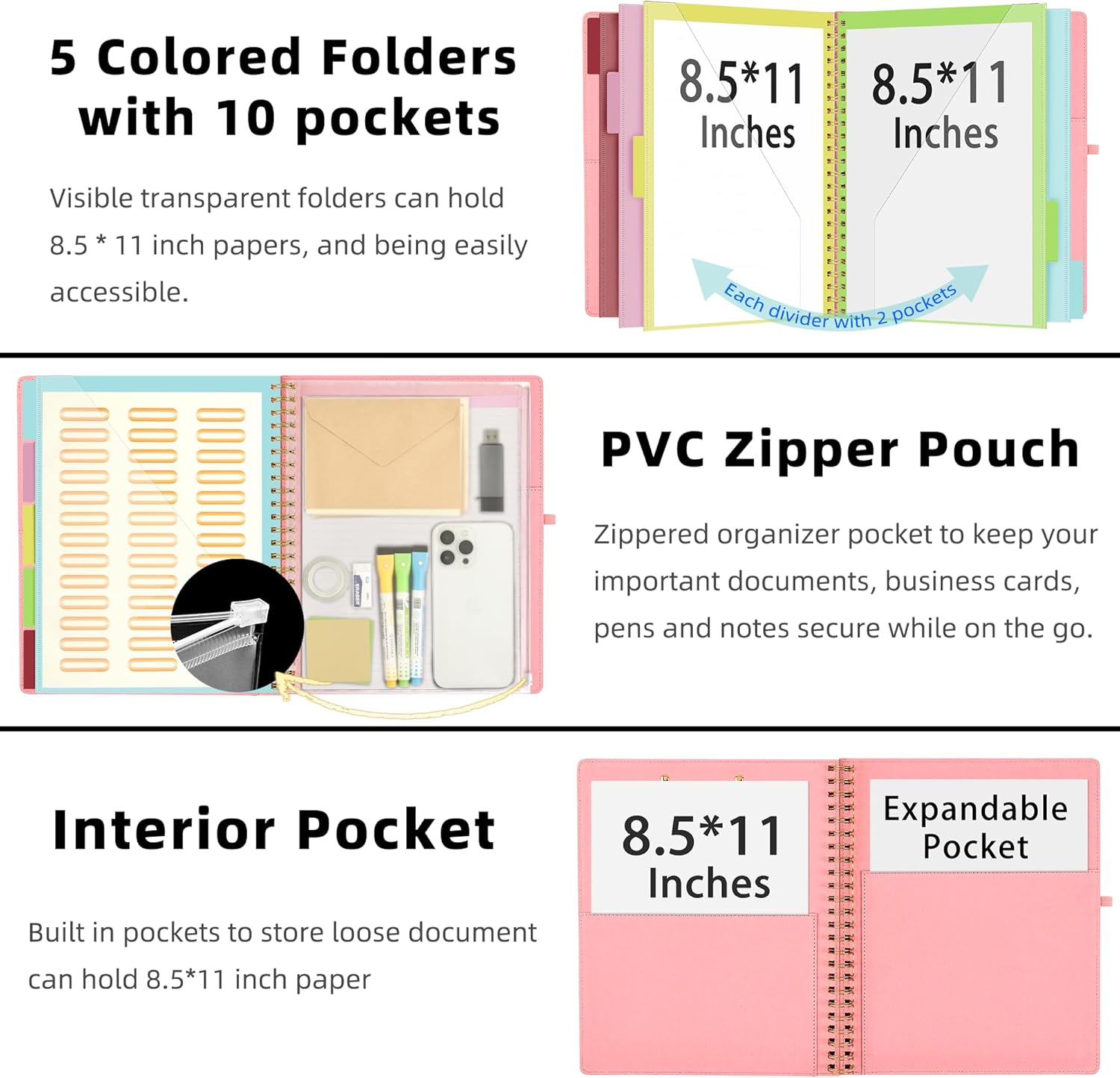 Ospelelf Pink Foldable Spiral Clipboard Folio with Storage Zipper Pouch, 5 Plastic Folders with 10 Pockets,Refillable Lined Notepad (11" x 8.5"), Hardcover Project Organizer with 39 Stickers