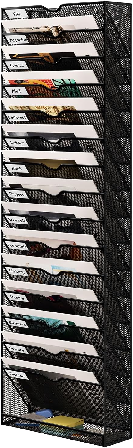 16 Tier Hanging Wall File Holder, Metal A4 Wall Mounted Document Holder, Vertical Hanging Mail Organizer, Magazine Storage Rack with Tray for Office Home Classroom, Black