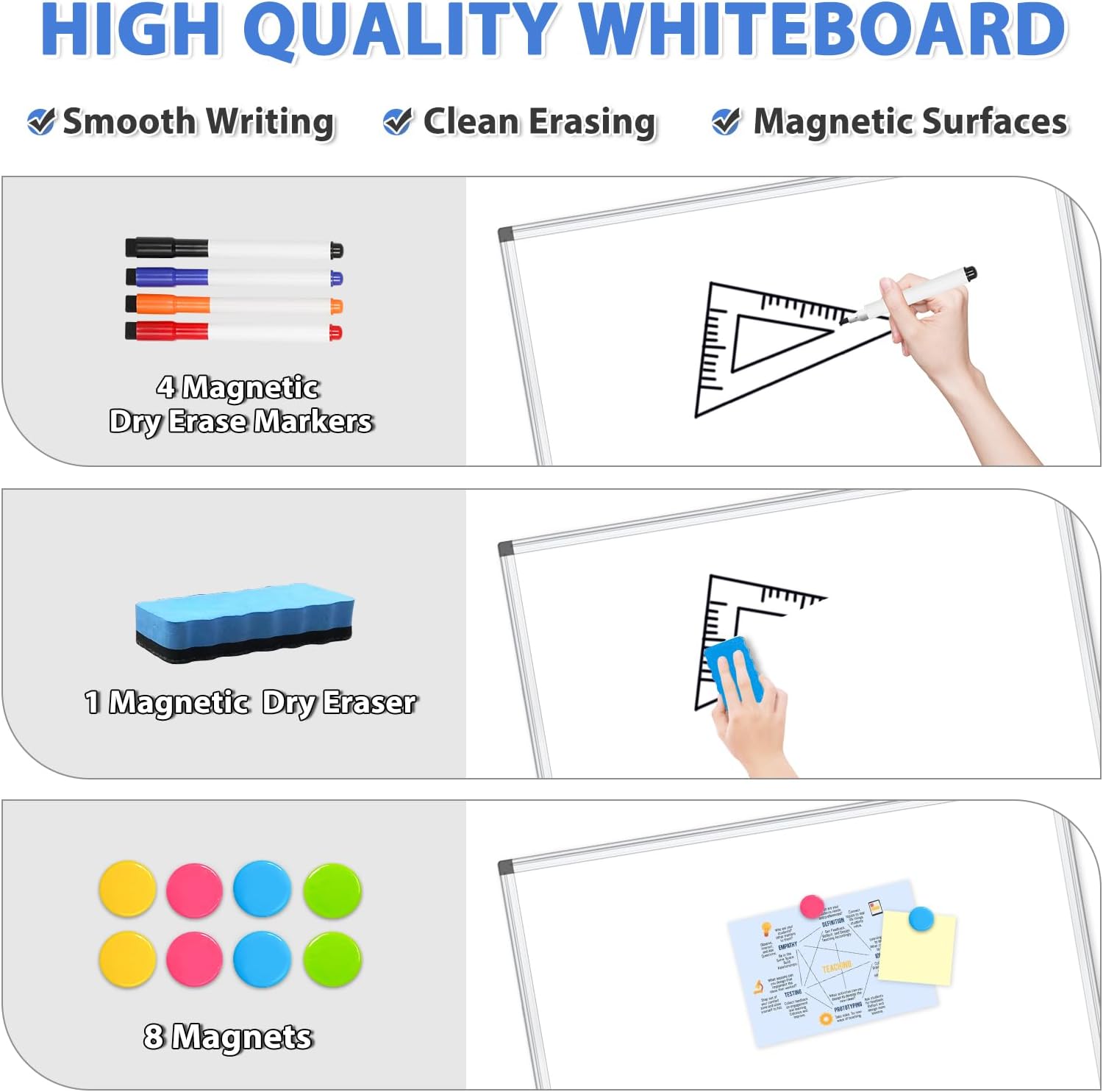 - 【Magnetic Surface & Double-sided】Experience effortless writing with our whiteboard's impeccably smooth surface, ensuring every stroke is clear and precise. When it's time to refresh your white board, cleaning is a breeze – simply wipe away writings with ease, leaving no residue behind. The magnetic feature not only enhances usability by allowing for easy attachment of notes or documents but also adds a touch of convenience to your workspace.
