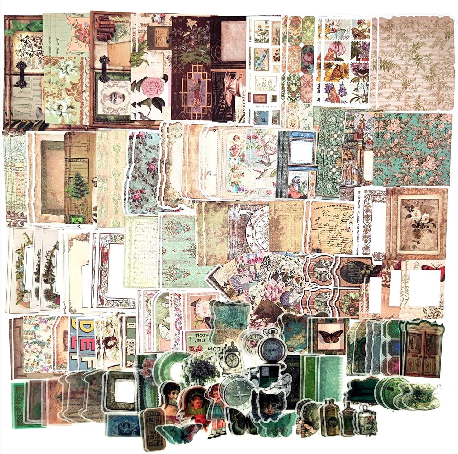 200PCS Vintage Scrapbooking Supplies Pack, Aesthetic Scrapbook Sticker Paper Art Journaling Kit for Bullet Junk Journals,Planner,Cottagecore Decor Gifts (Green Vintage Collection)