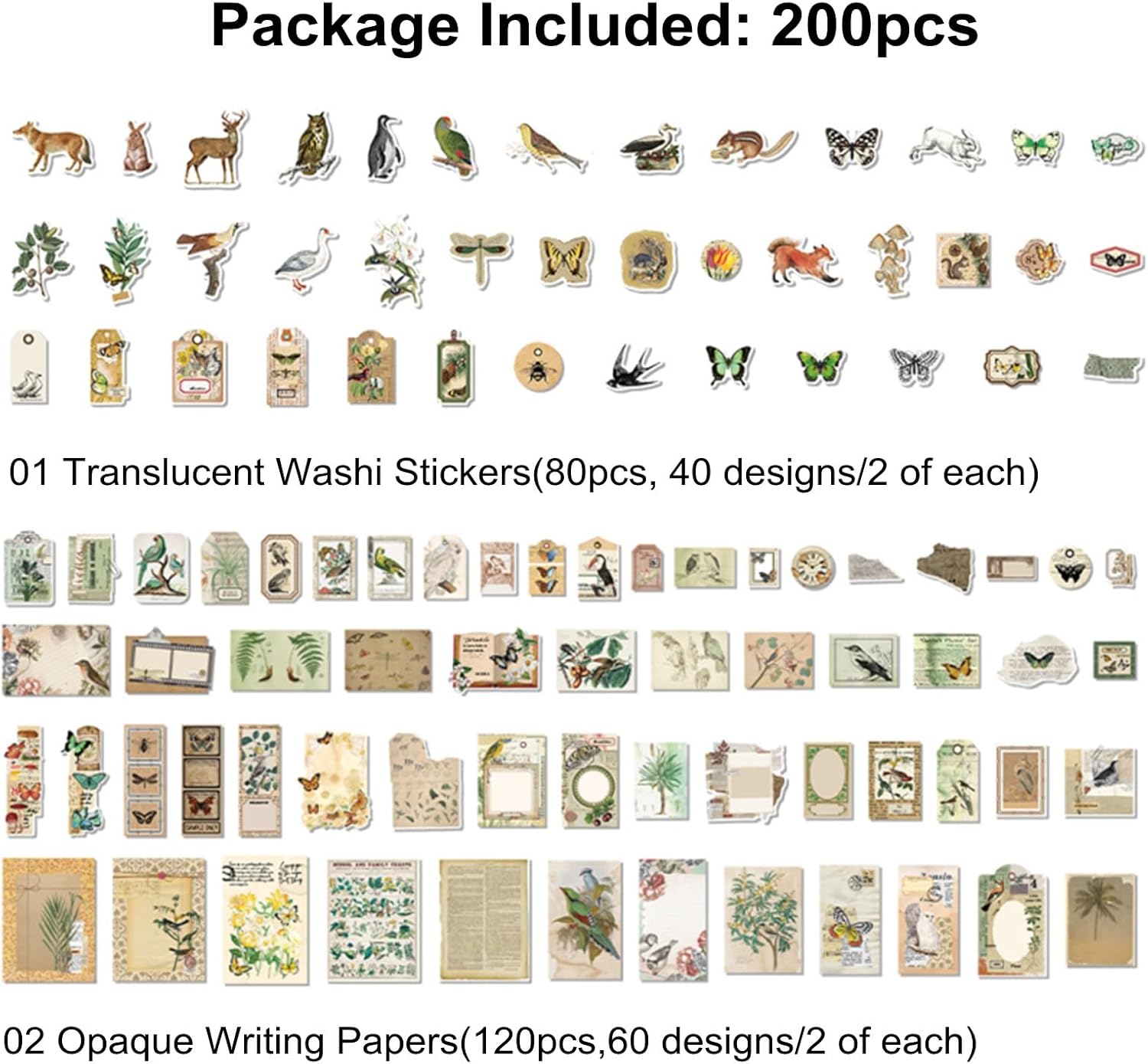 - Design: 120pcs vintage printing papers with 60 designs , 2 pieces of each; 80pcs washi stickers with 40 designs, 2 pieces of each.