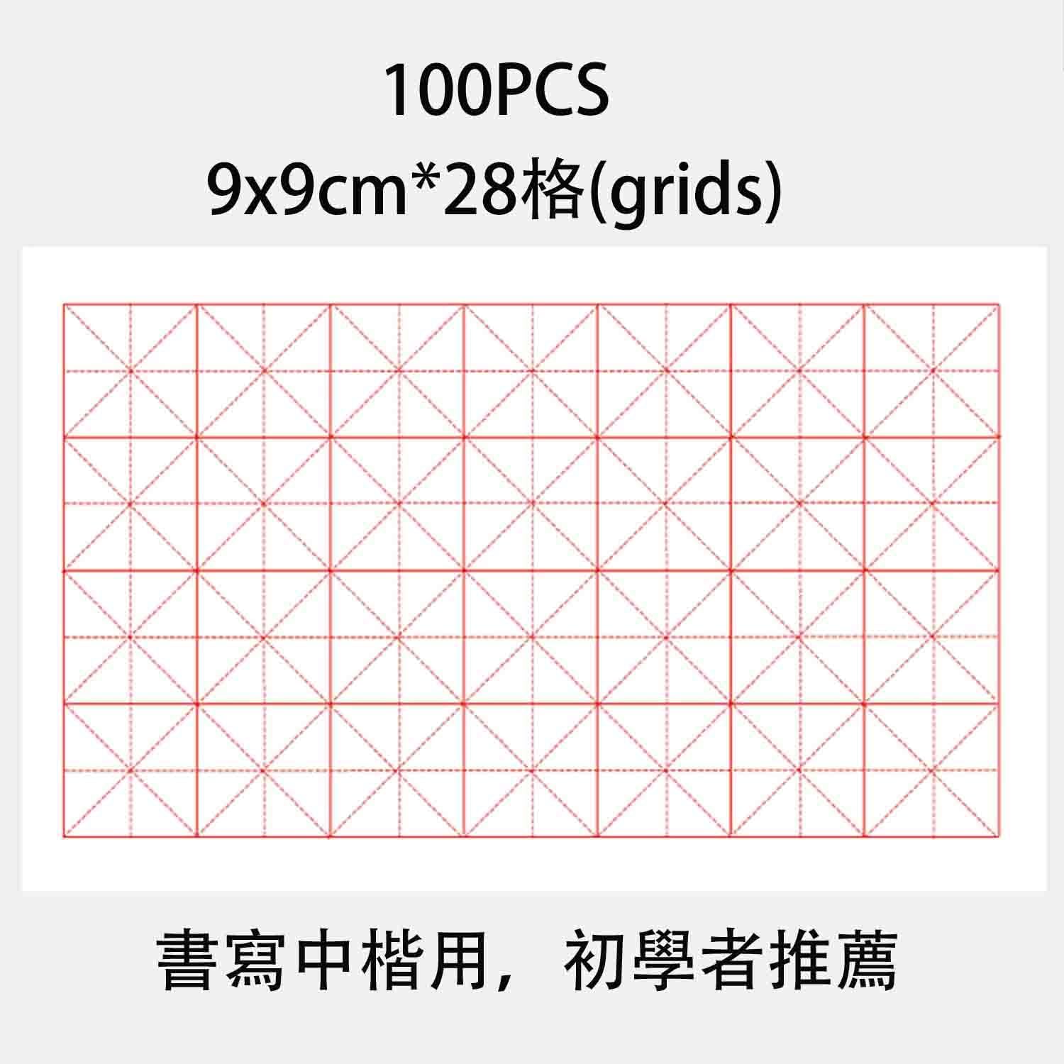 - PRODUCT DETAILS: It include 100 sheets grid half sheng shu (half raw ripe) xuan papers, 28 grids/sheet, 9 cm(3.54")/grid, sufficient quantity for you to practice Chinese calligraphy, perfect for Chinese calligraphy beginners and lovers