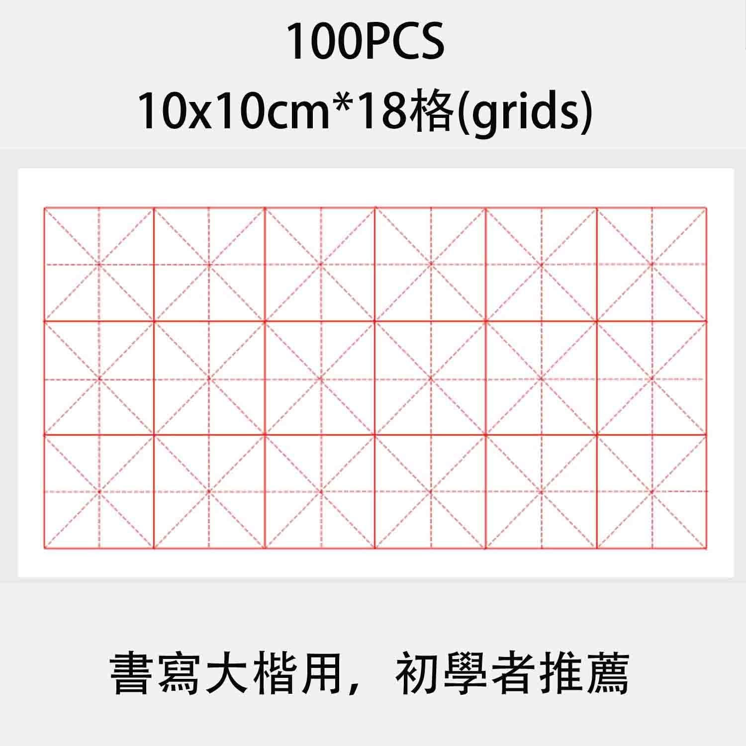 - PRODUCT DETAILS: It include 100 sheets grid half sheng shu (half raw ripe) xuan papers, 18 grids/sheet, 10 cm(3.9") /grid, sufficient quantity for you to practice Chinese calligraphy, perfect for Chinese calligraphy beginners and lovers