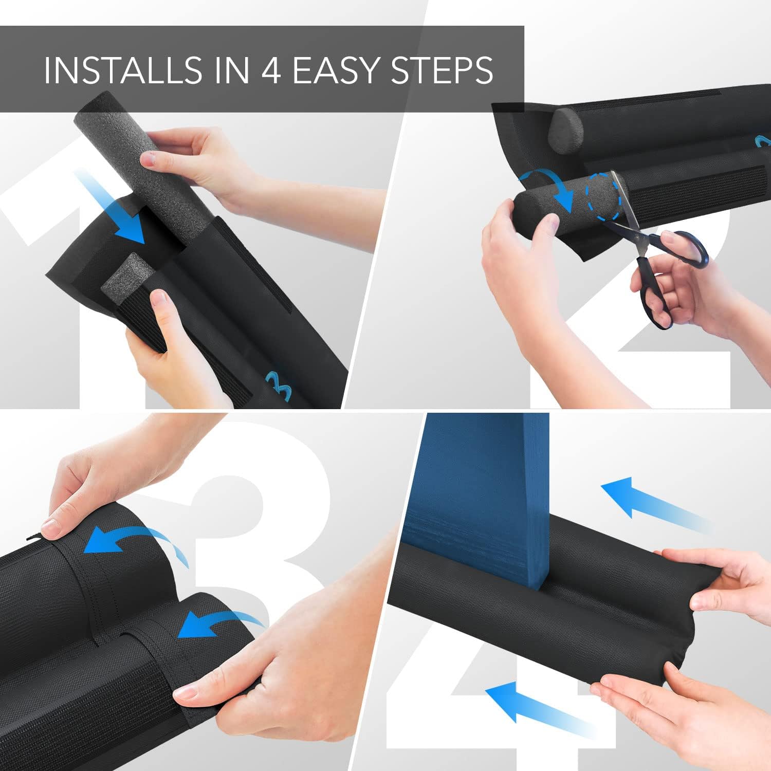 - QUICK AND EASY INSTALLATION: Install in a few easy steps - cut foam strips, insert into cover, and slide under the door; No drilling required, making it one of the easiest door draft stoppers for bottom of door to set up; No adhesives or tacks needed