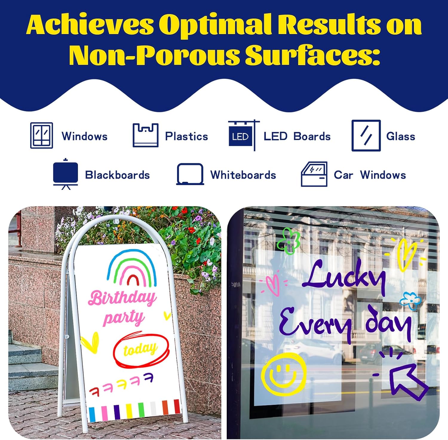 - 【Versatility Across Surfaces】Whether used as auto window markers or for glass washable projects, these jumbo chalk markers prove their versatility on any non-porous surface. Ideal for car decoration, whiteboards, chalkboards, bistro boards, Christmas banners, posters, and various DIY arts and crafts.