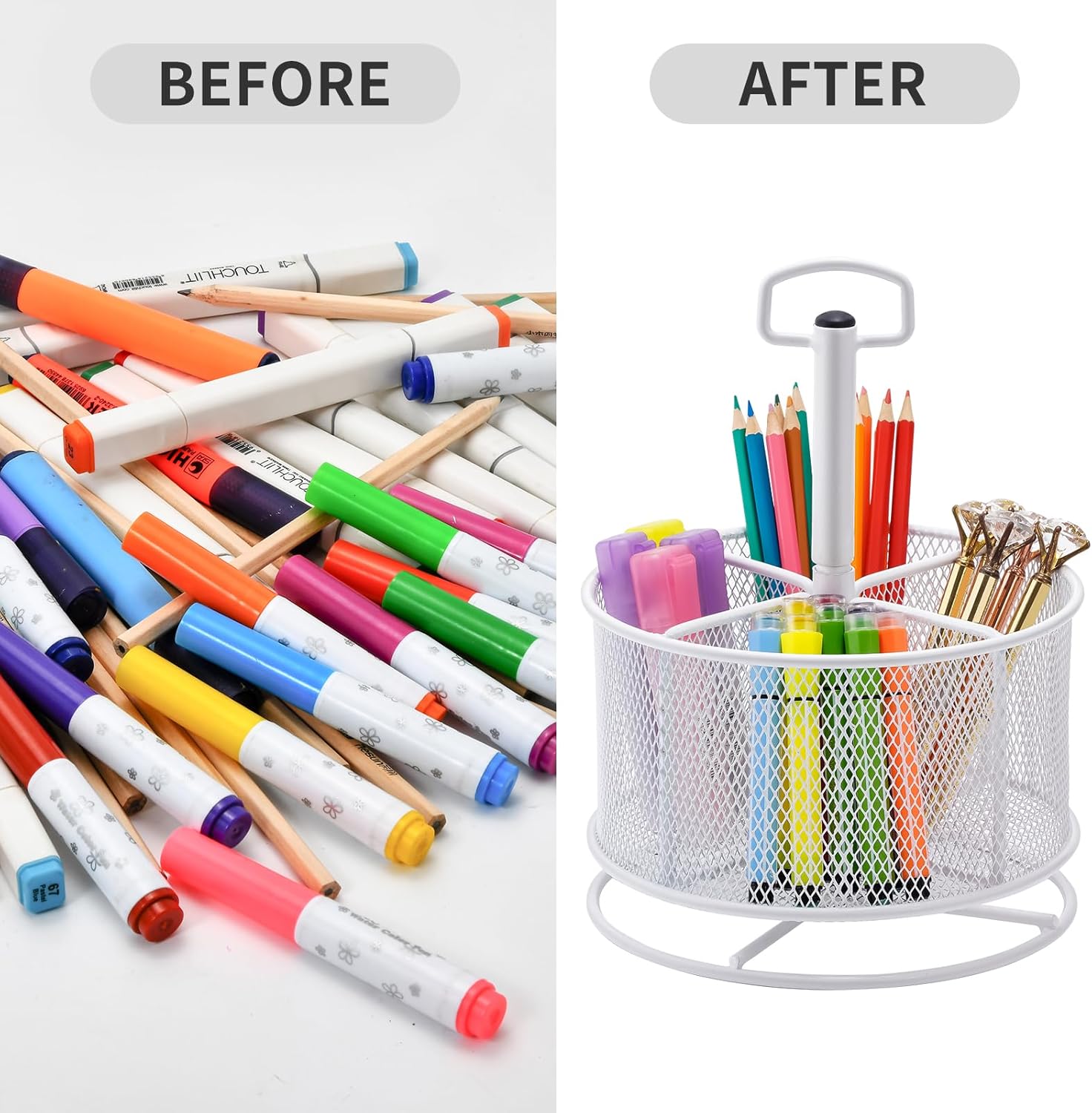 - ăMultipurpose Desktop Organizeră: This rotating storage organizer is perfect for pencils ,cosmetics, bathroom necessities, toiletries and even kitchen utensils.Try it in your craft room, playroom, laundry/utility room and even inside bathroom cabinets or under the sink; Store extra office supplies like painting pens, correction tape,scissors ,TV Remote and more; Even headphones or a charger will no longer be lying around in the future! Maximize your vertical space and keep your desk clear