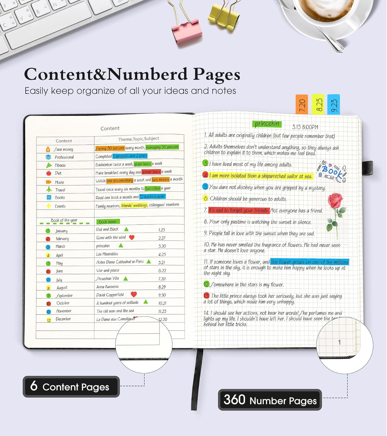 - 【Humanized Design】 ❶ 360 numbered pages, 6 contents pages, you can easily keep organize of all your ideas and notes.❷2 Divider sticky notes, 2 Bookmarks to help you find important content faster..❸ Back Inner pocket can holds notes, business cards, small gadgets, etc. ❹ Closes with an elastic band, Pen holder loop for any pen.
