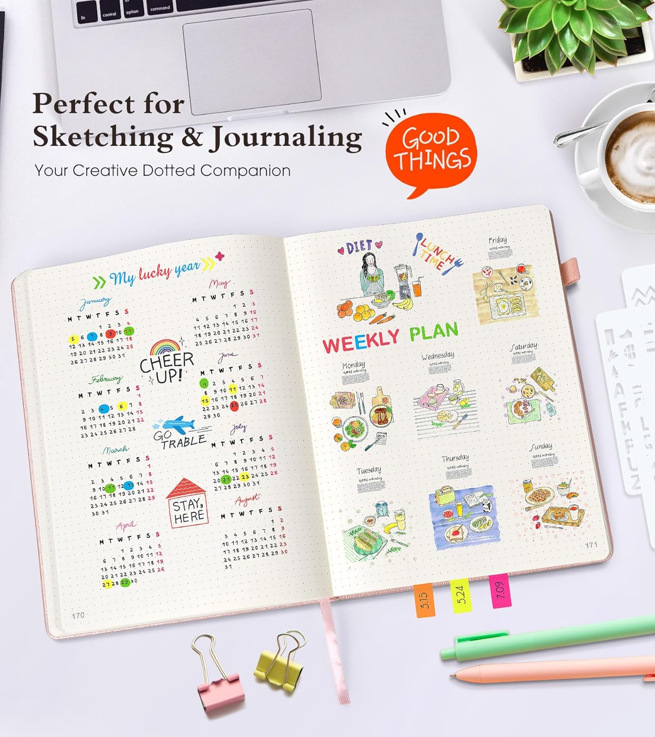 - 【180°Lay Flat Dot Notebook】 The 180° lay flat design makes writing easier, reading more convenient, and taking notes more efficient.At the same time, the bullet dot journal is designed with1 elastic closure band & 1 elastic bookmark band. to make it tightly closed to protect your content, and the inner paper will not be curled and kept flat.