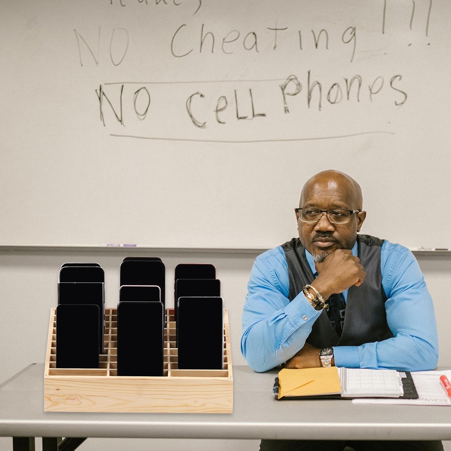 30-Grid Wooden Cell Phone Holder Desktop Organizer Storage Box for Classroom Office (30-Grid)