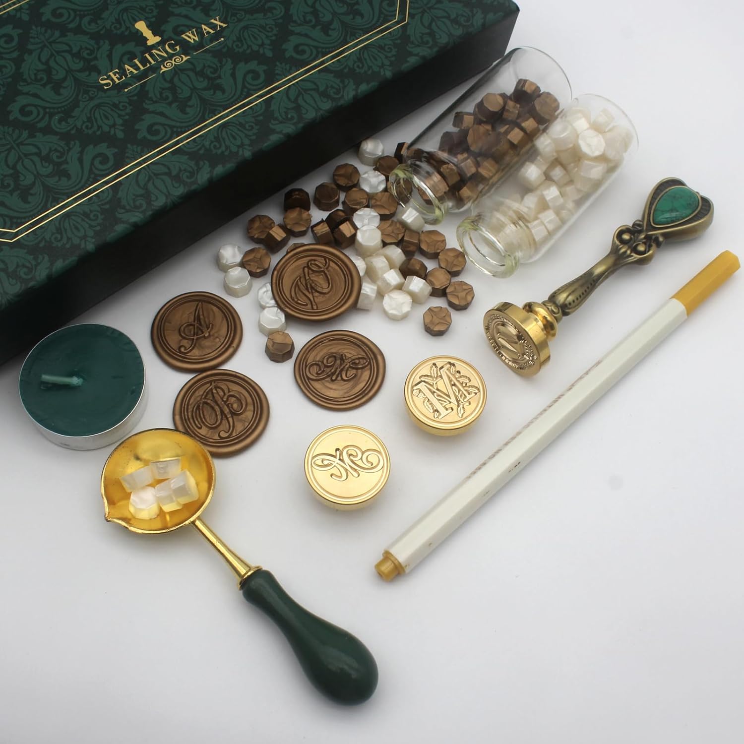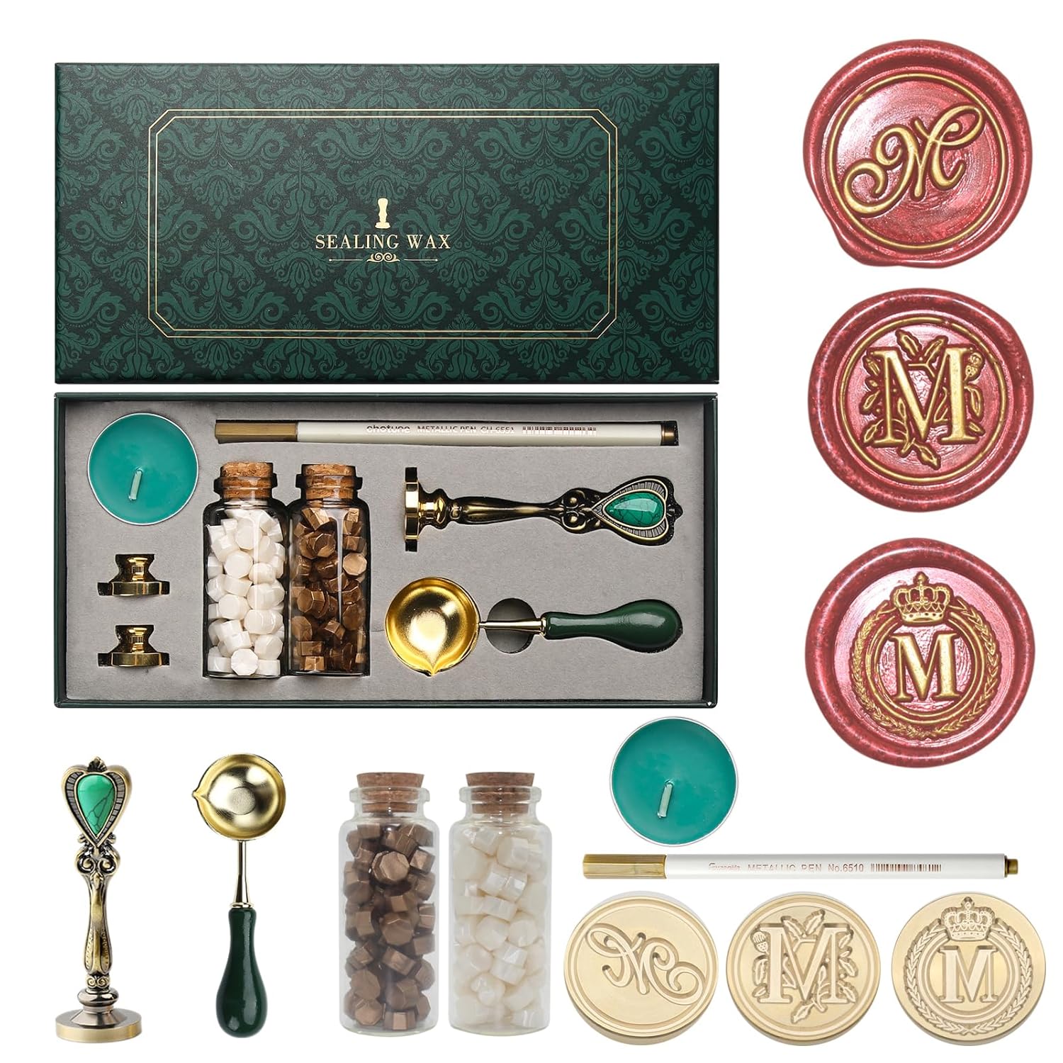 - Vintage Gift Box Wax Seal Stamp Kit: The complete wax seal kit comes with 3 unique initial alphabet sealing wax stamp brass head M in handwritten, crown pattern and iris pattern styles, 1pcs vintage metal handle that allows for easy head replacement, 2 bottles of wax seal beads in preal white and antique gold colors (appr. 80pcs per bottle), a wax seal spoon, a gold wax seal pen for coloring the seals, and a vintage-inspired ink green gift packaging box