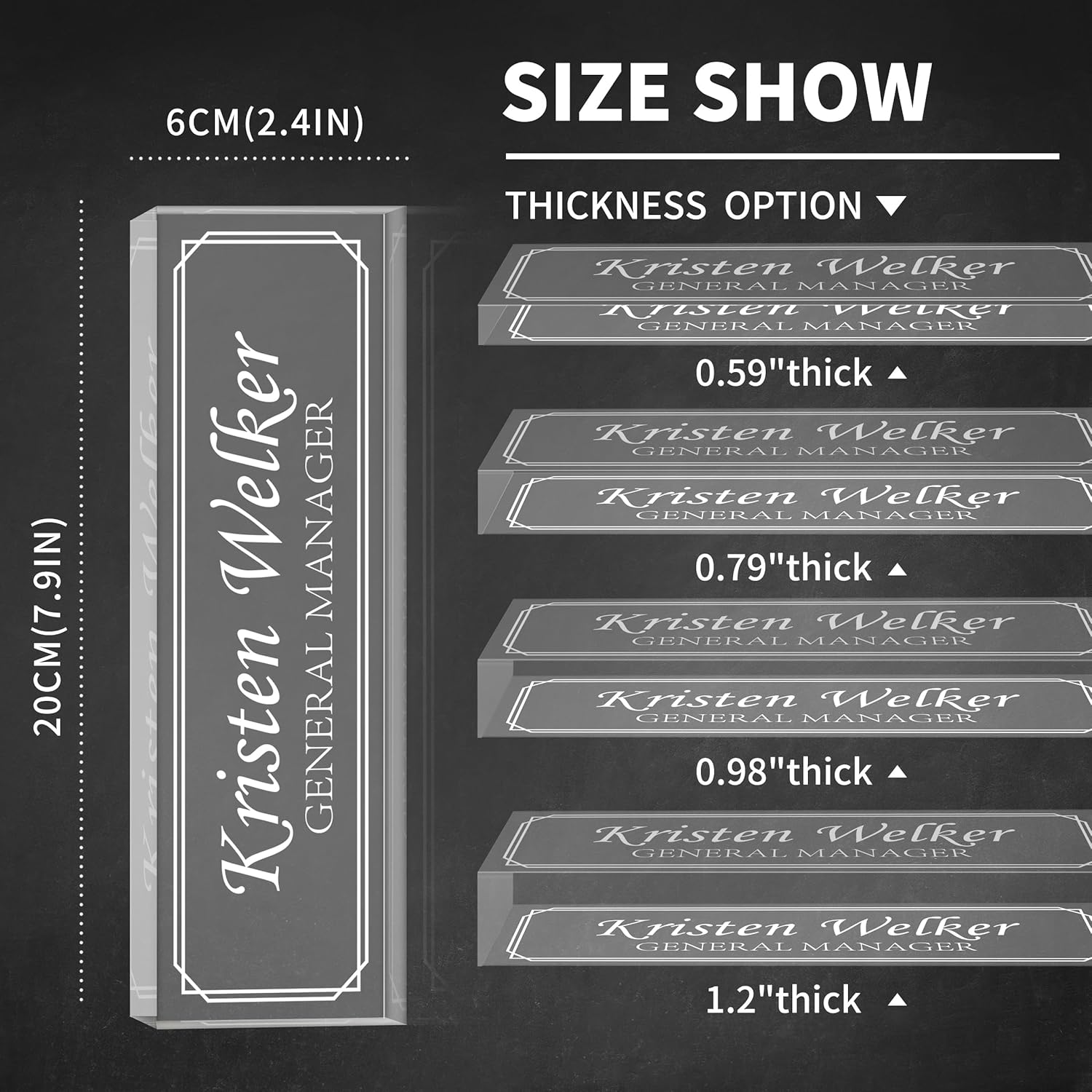- đăPersonalization OptionsăWe have hundreds of designs for you to choose from, there is something for you. Professional designers design unique styles, laser engraving will never be engraved, there are 4 thicknesses and 2 Layout Options to choose from, the thickness is 0.59/0.79/0.98/1.2 inches to meet all your needs, choose the one that suits you and click Brighten up your desk. Please click the "Customize Now" button to customize your exclusive nameplates together!