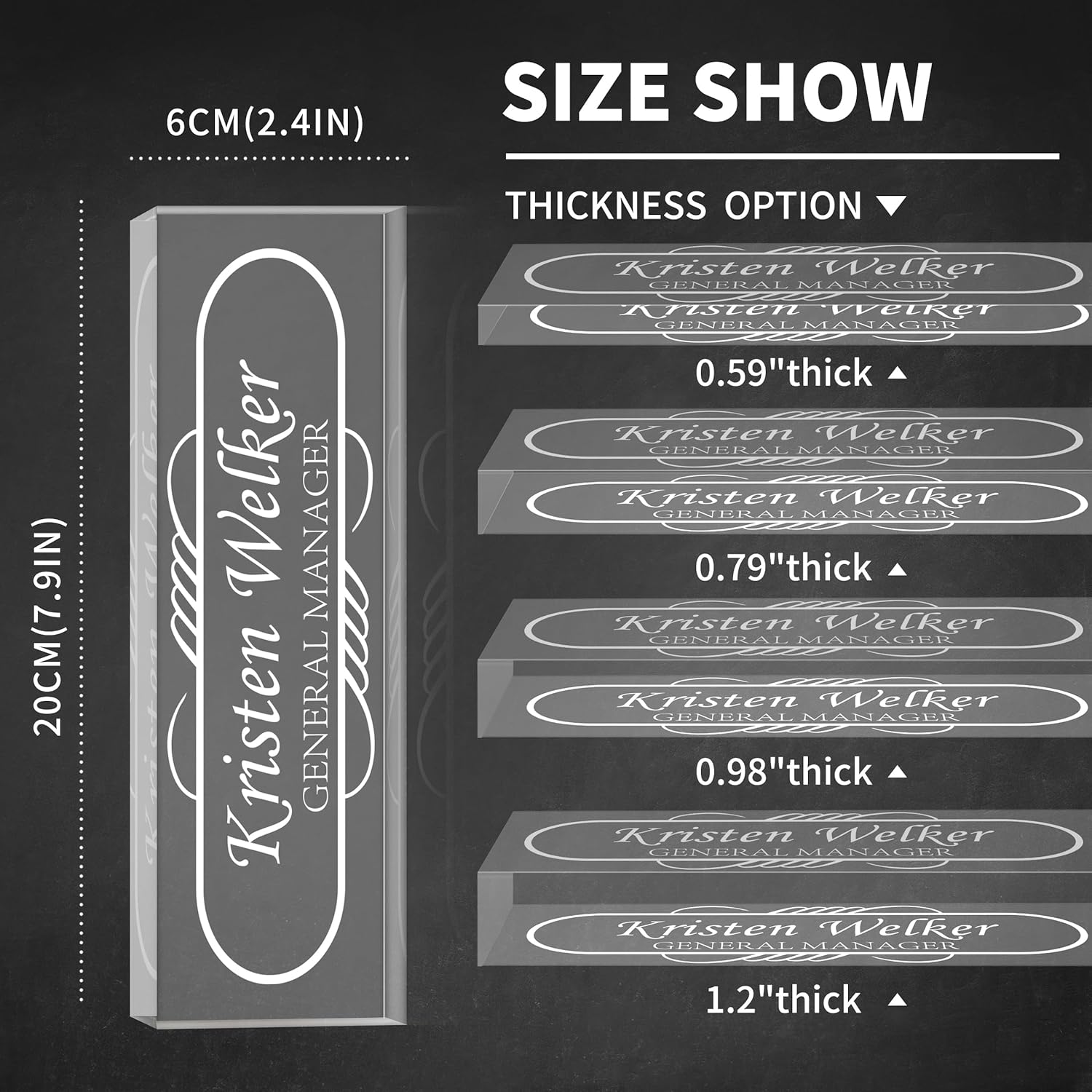- đăPersonalization OptionsăWe have hundreds of designs for you to choose from, there is something for you. Professional designers design unique styles, laser engraving will never be engraved, there are 4 thicknesses and 2 Layout Options to choose from, the thickness is 0.59/0.79/0.98/1.2 inches to meet all your needs, choose the one that suits you and click Brighten up your desk. Please click the "Customize Now" button to customize your exclusive nameplates together!