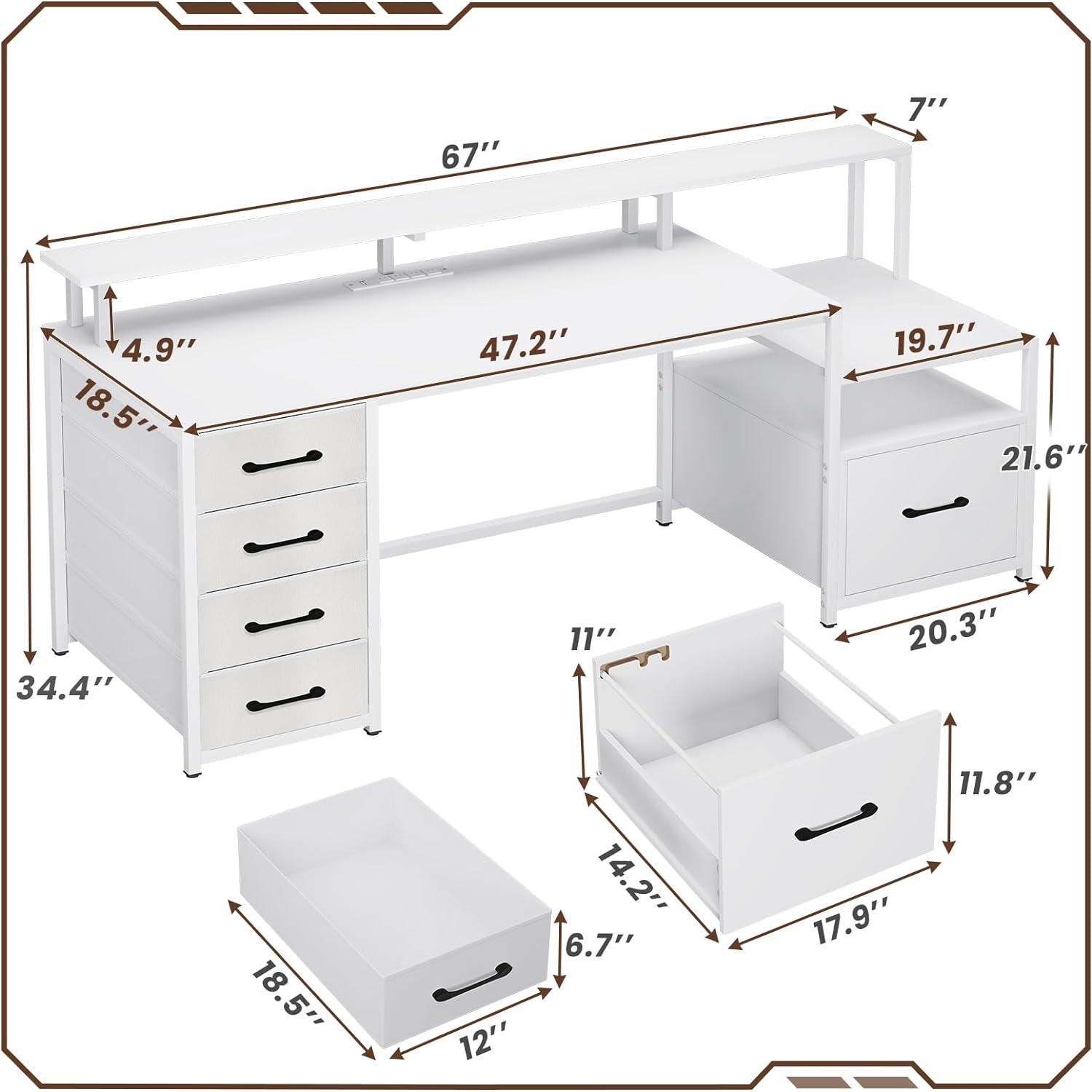 SEDETA White Computer Desk with 5 Drawer & Power Outlet, 66'' Home Office Desk with File Drawer, Storage Shelves, Printer Cabinet and Monitor Shelf, Gaming Desk with Led Lights