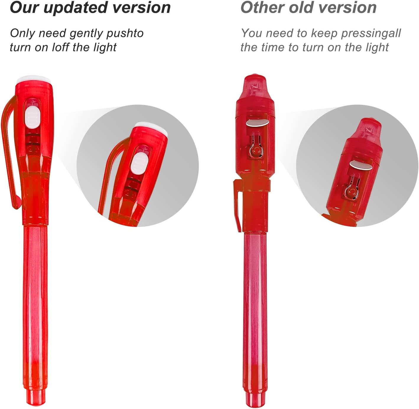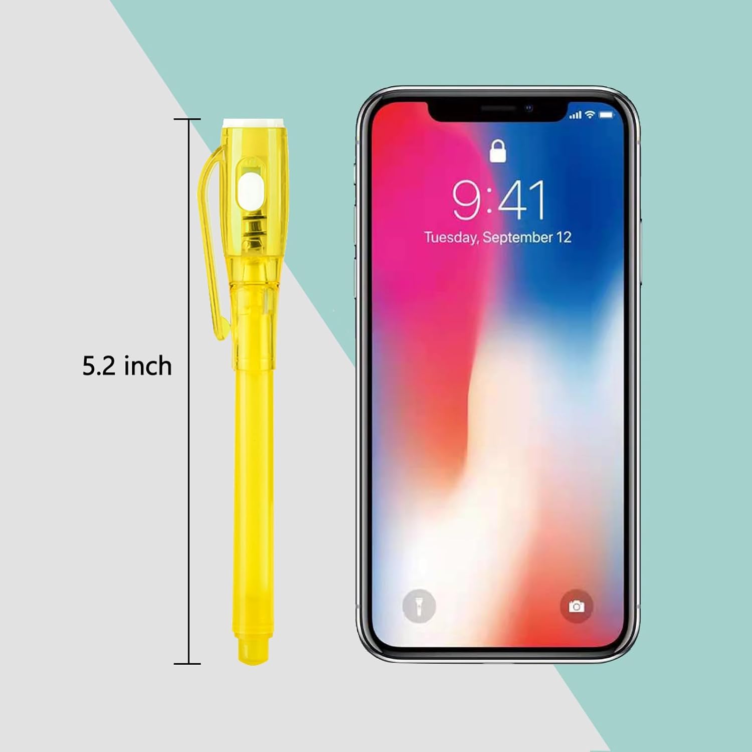 - Spy Pen: The ink is invisible after you write with it unless you light on the cap blacklight to see the secret message perfectly. The reusable magic pen with built-in lights has 7 different colors, but the ink is the same color.