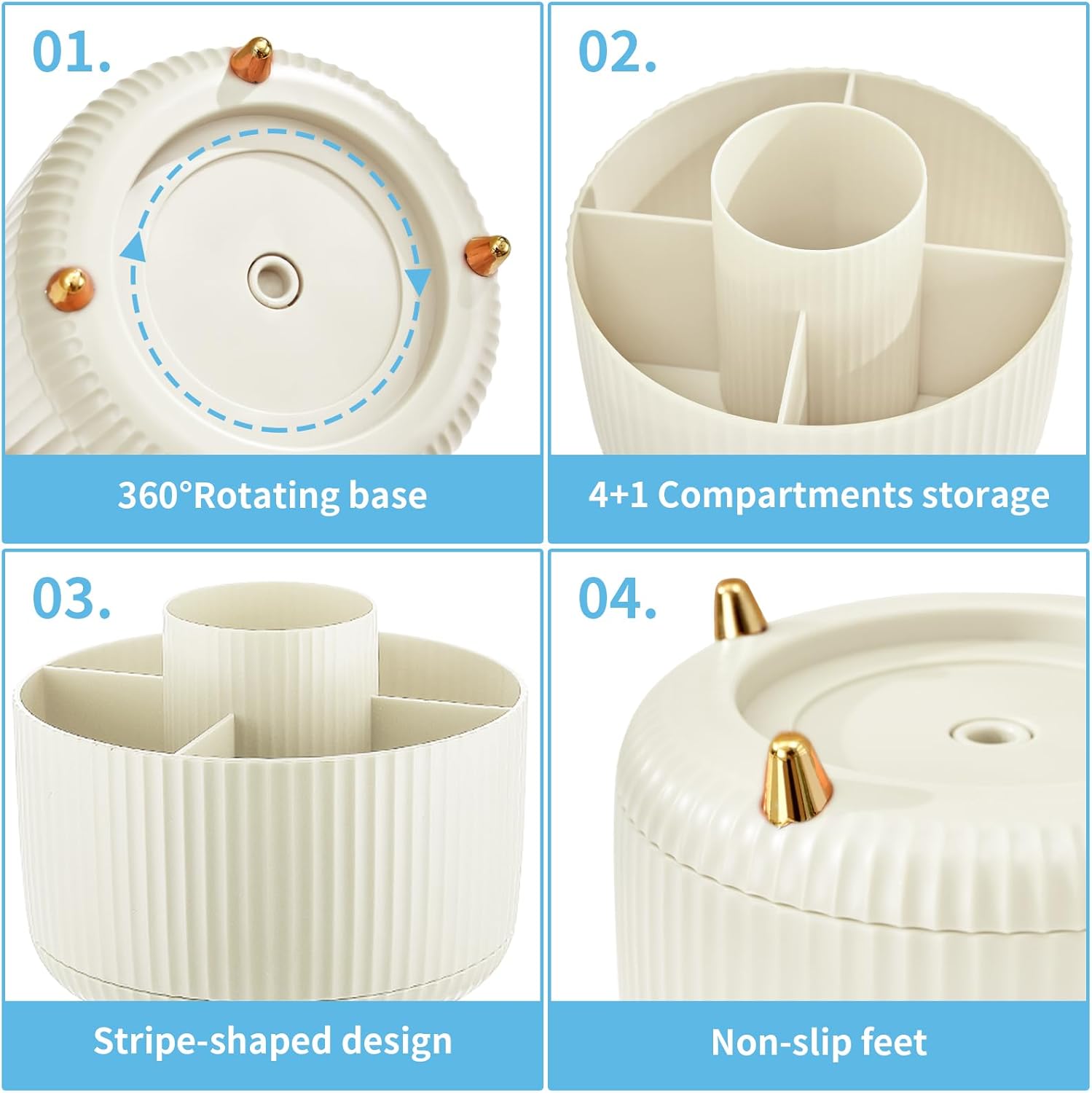- ăSmart 360 Degree Revolving Designă: This desktop organizer can be turned up to 360-degree rotation to the left and right. This storage caddy allows you to keep all of your small items within reach while staying out of your way. You can always get what you want quickly and easily. The product can be bilaterally and smoothly rotated, just turn as you please