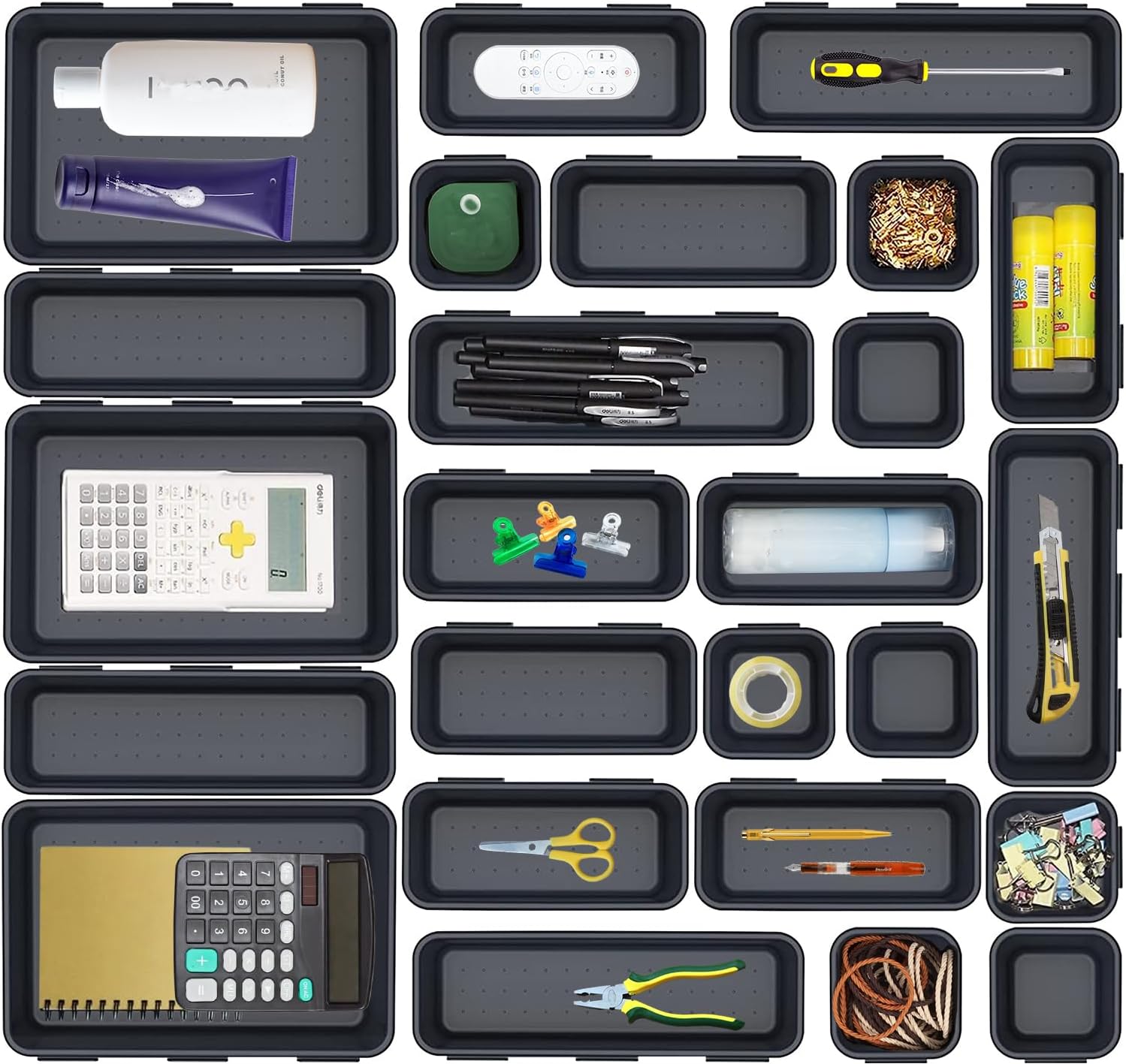 - 【MULTI-PURPOSE STORAGE】25 Pcs customizable drawer bins include 3 large,6 medium 8 small square and 8 small rectangular trays.It’s easy to find a configuration that works for your drawers or desktop.You could use them in bathroom,office,dorm room and more.