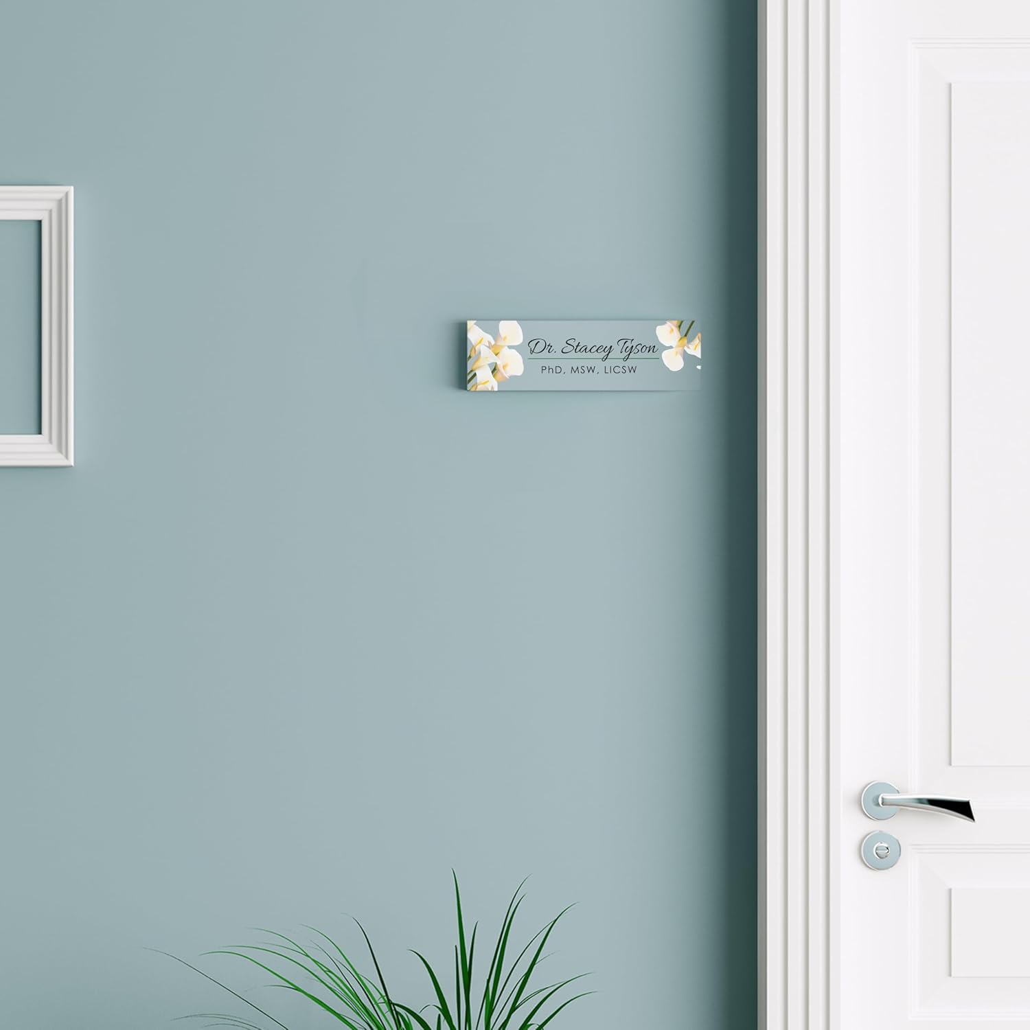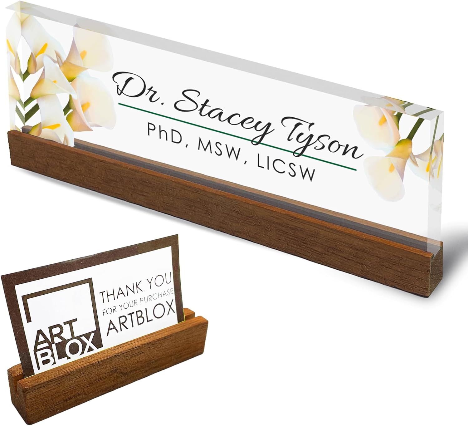 Artblox Personalized Office Desk Name Plate and Business Card Holder | Clear Acrylic Glass with Teak Wood Stand | Calla Flowers Design Customized with Your Name and Credentials Office Desk Decor