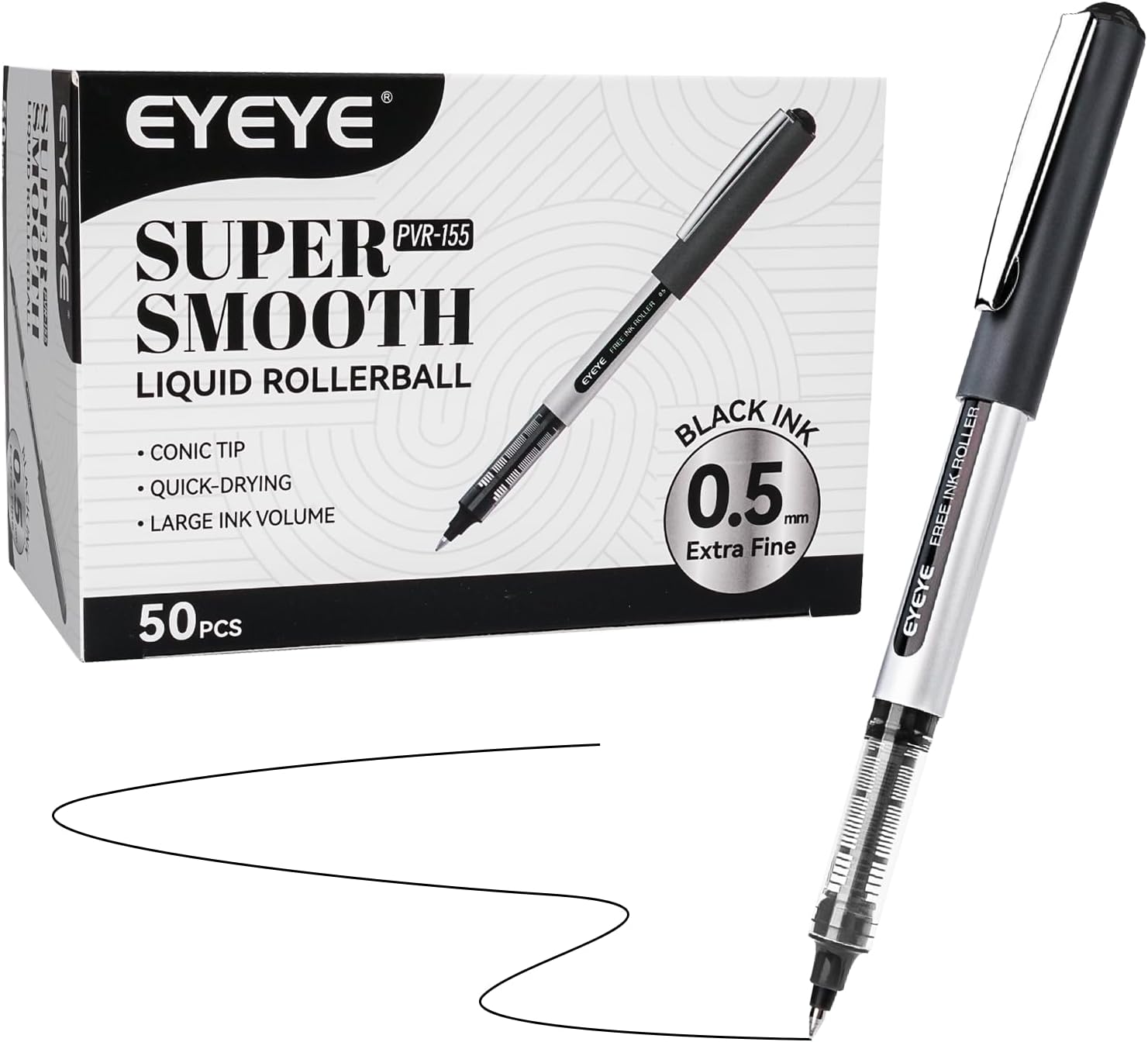EYEYE Rollerball Pens 0.5mm Black 50 Pack, Extra Fine Point Quick Dry Liquid Ink Roller Ball Pens Fine Point Smooth Writing Pen for Journaling, Note Taking, Office, School Supplies