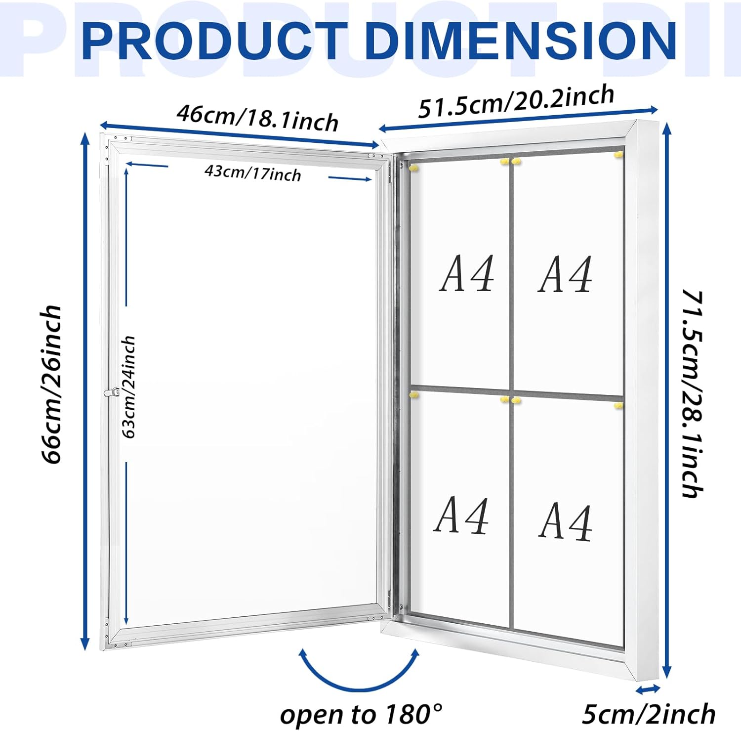 - 💧OUTDOOR USE —The weather-resistant cabinet construction features an aluminum frame with a smooth surface and full-length piano hinges that add strength and durability to the door frame. Drain holes on the bottom and a sealed backing mean you can mount the board outdoors.