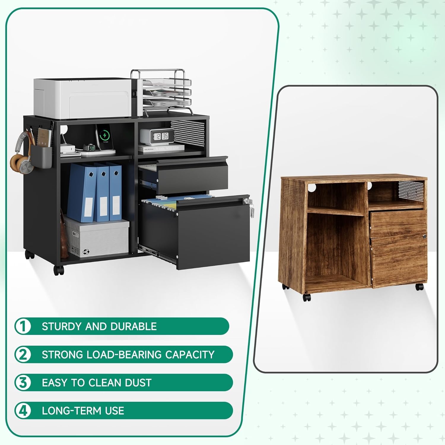 - ăEasy to moveă4 removable wheels- printer stand can be moved and adjusted in position freely,2 wheels lockable to keep cabinet stableïŒDrawer with lock ensure the safety of items.