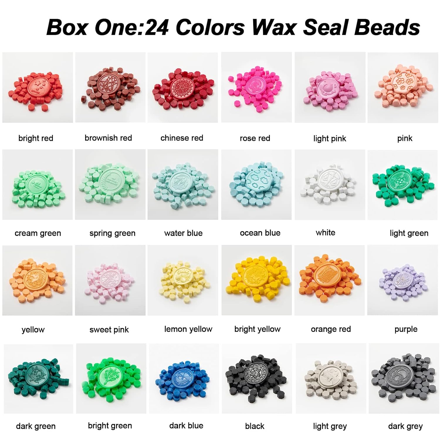 - Package Includes:10 inch three-layer multipurpose storage box,1200pcs wax seal beads in 48colors,4pcs wax seal stamps,1pcs wooden handle,1pcs wax seal warmer,2pcs sealing wax spoon,1pcs silicone mat,1pcs stirring rod,10pcs stickers,20pcs tealight candles,5pcs metallic pens,5pcs vintage envelopes.