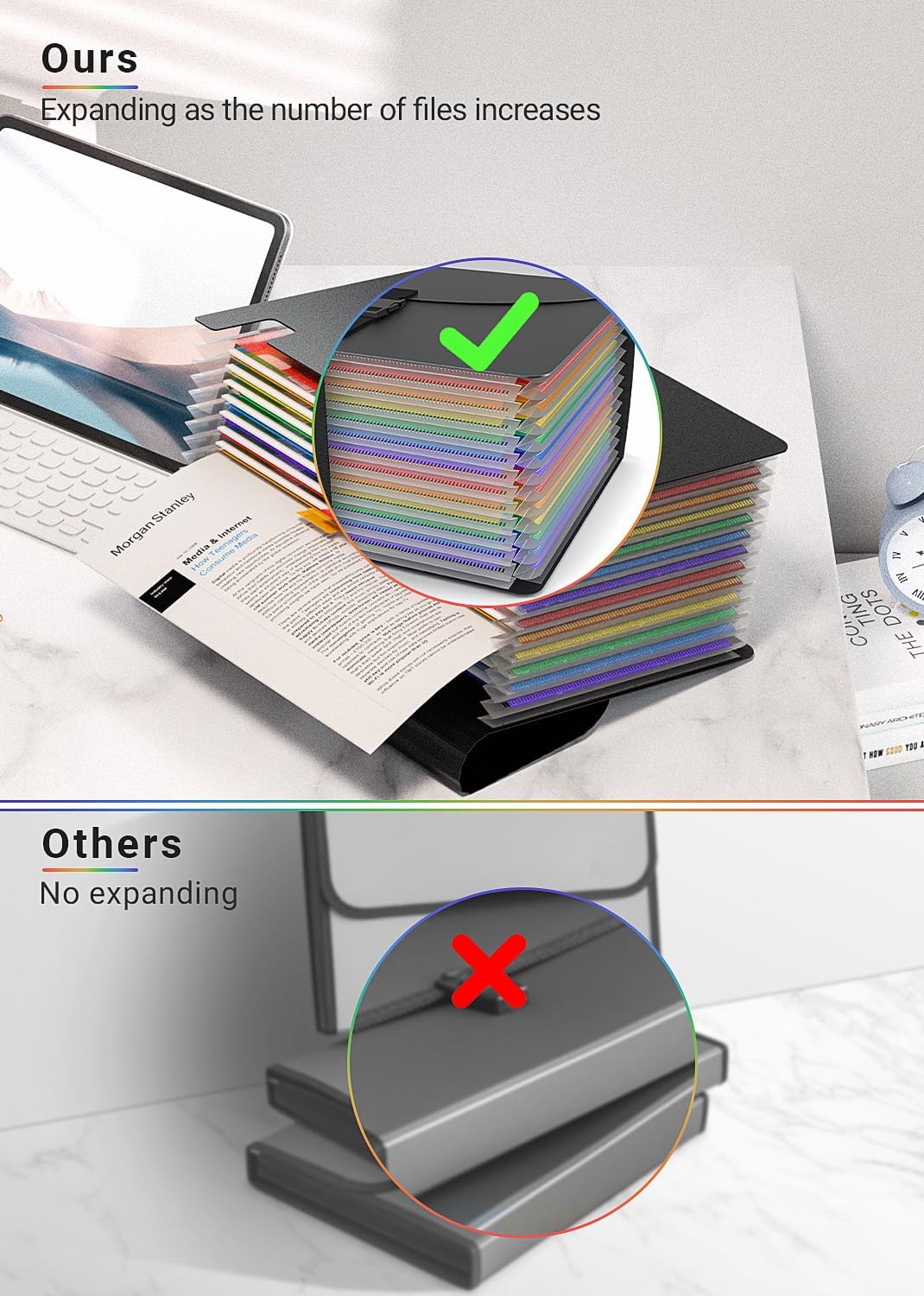 - ✔【TOP-GRADE MATERIALS】Expandable file folder are made by high quality polypropylene and polyester, 20% and more thicker than other file folders, it can stand on the desktop independently, no easy to be broken and deformed. 100% Waterproof, Non toxic, Non Odor, Anti-wear, tear and Moisture resistant.
