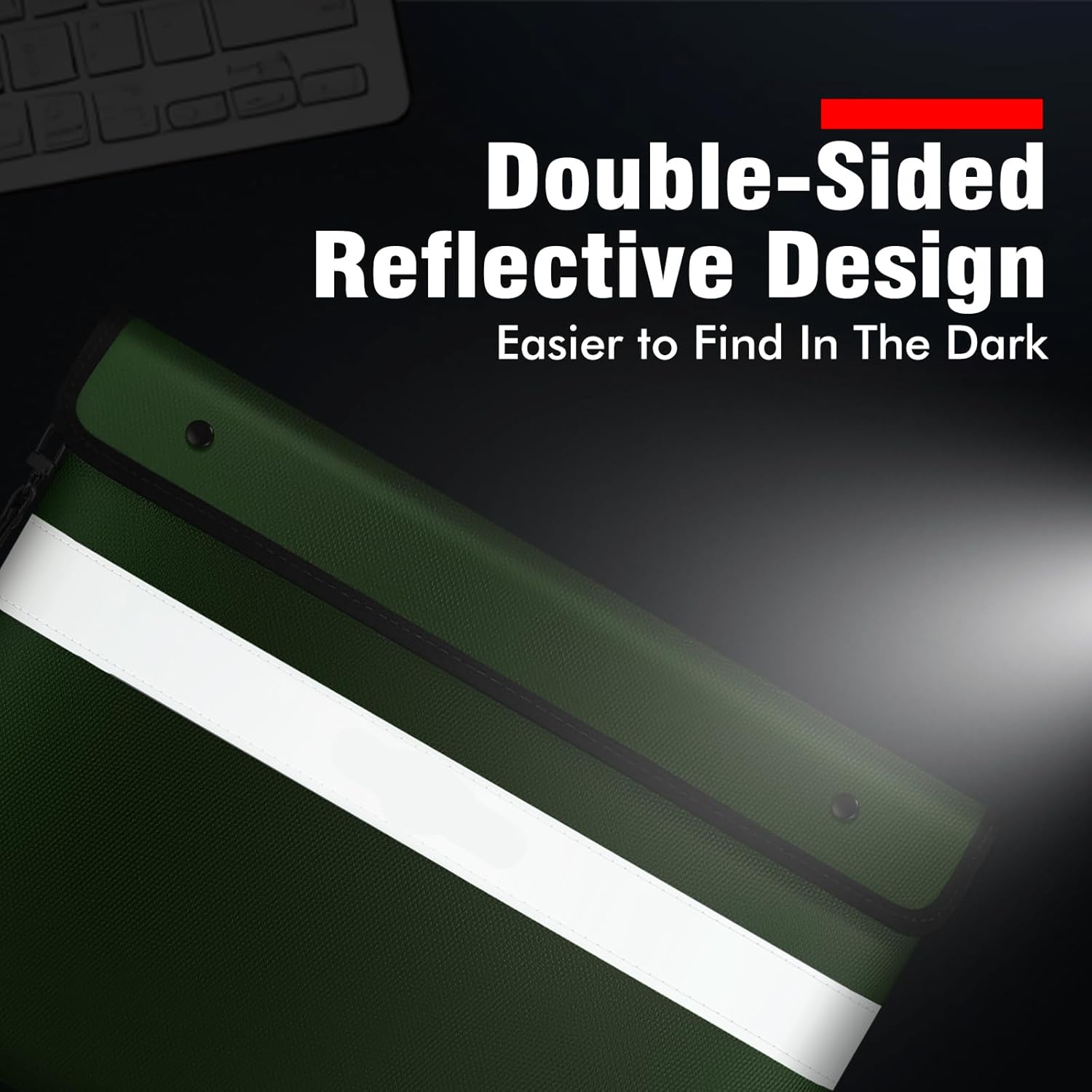 - ☔【Unique Design】This fireproof bag is not only functional but also stylish. It has a unique double-sided reflective strip that allows you to clearly see its position in the dark no matter how you place it. Its zipper is a treated waterproof zipper, combined with the Sticky buckle flip closure design, so that the fireproof bag can protect your documents under high-pressure water cannon, but note that it is not waterproof when submerged underwater.