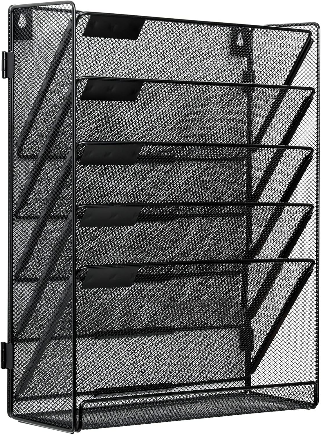 - Multi-Tier Wall Files: This wire mesh file organizer features 5 vertically arranged pockets for letter-sized files, enabling easy storage and organization of a large quantity of files, folders, and documents. A flat tray at the bottom that can hold pens, pencils, scissors, rulers and other accessories