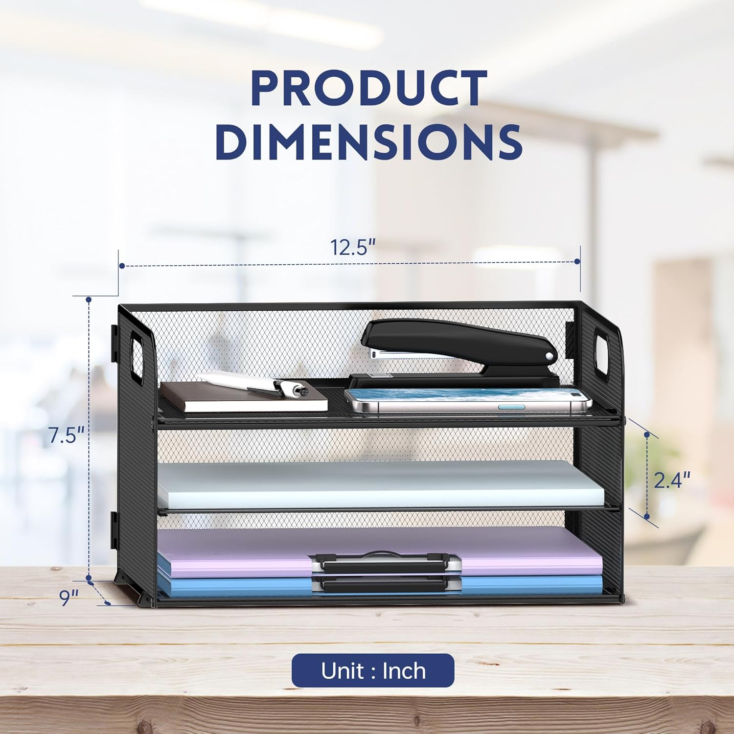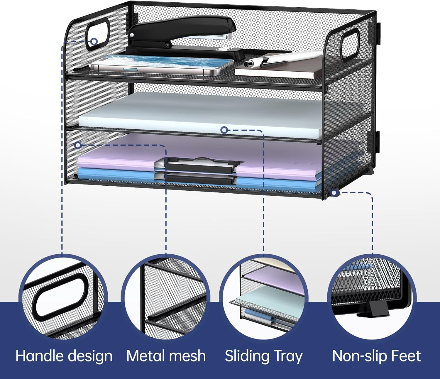 Supeasy 3 Tier Paper Organizer with Handle, Mesh Desk Organizer Letter Tray, Paper Tray File Organizer for A4 File Folder, Black