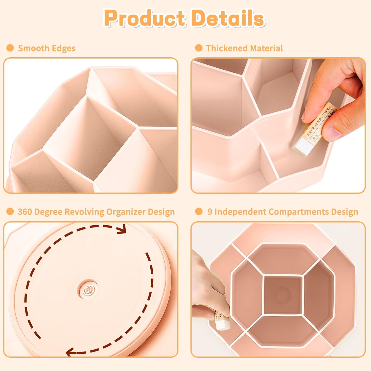 - ăPerfect design & large capacityăThis desktop organizer features a diamond-faced design with 9 high-capacity individual compartments to meet your every need. This turntable pencil holder for your desk is not only perfect for storing your desktop stationery such as pens, pencils, markers, highlighters, rulers, staplers, flash drivers, erasers, paper clips, scissors, letter openers, and many other desk widgets but also great for storing your makeup brushes, nail polishes, lipsticks, and other small personal items