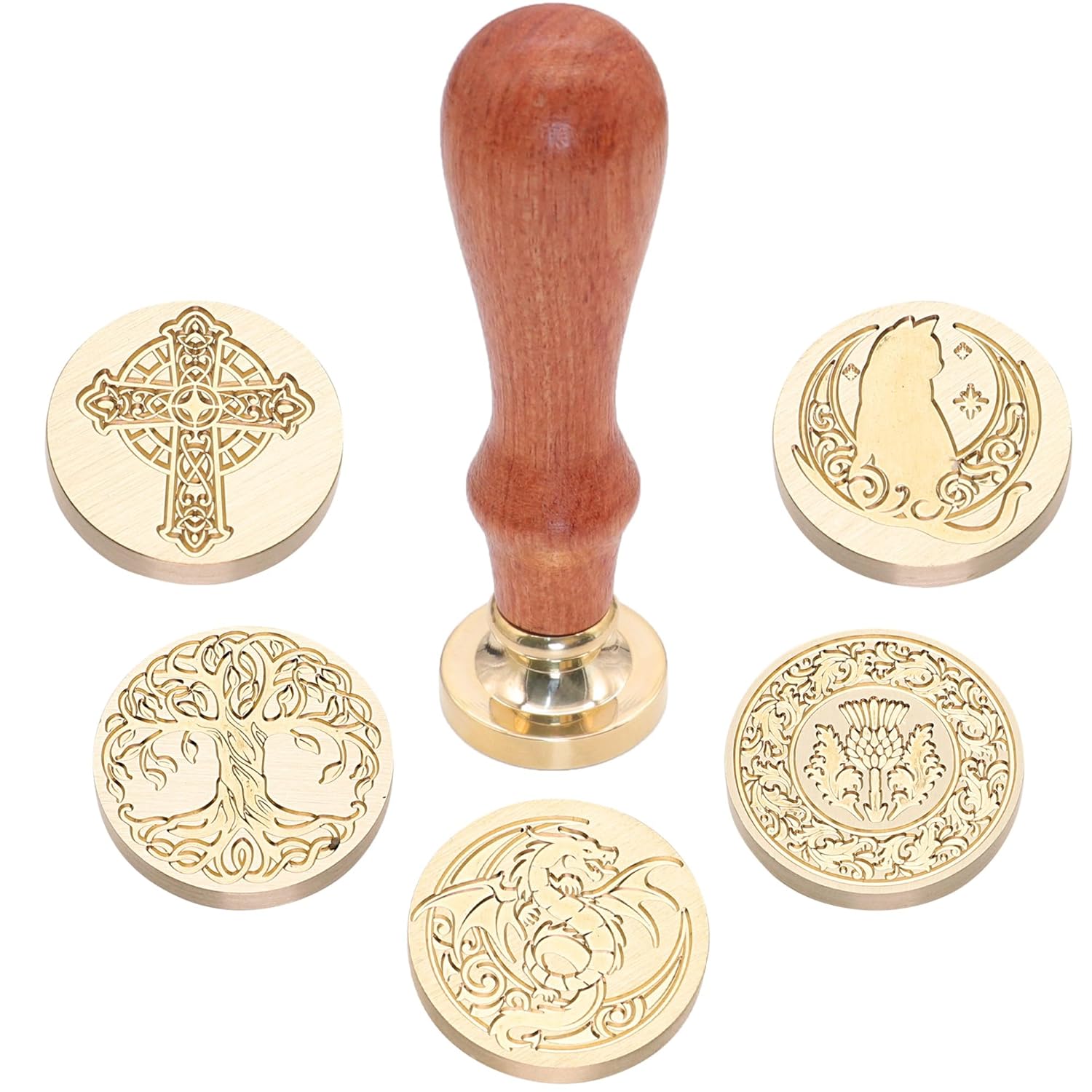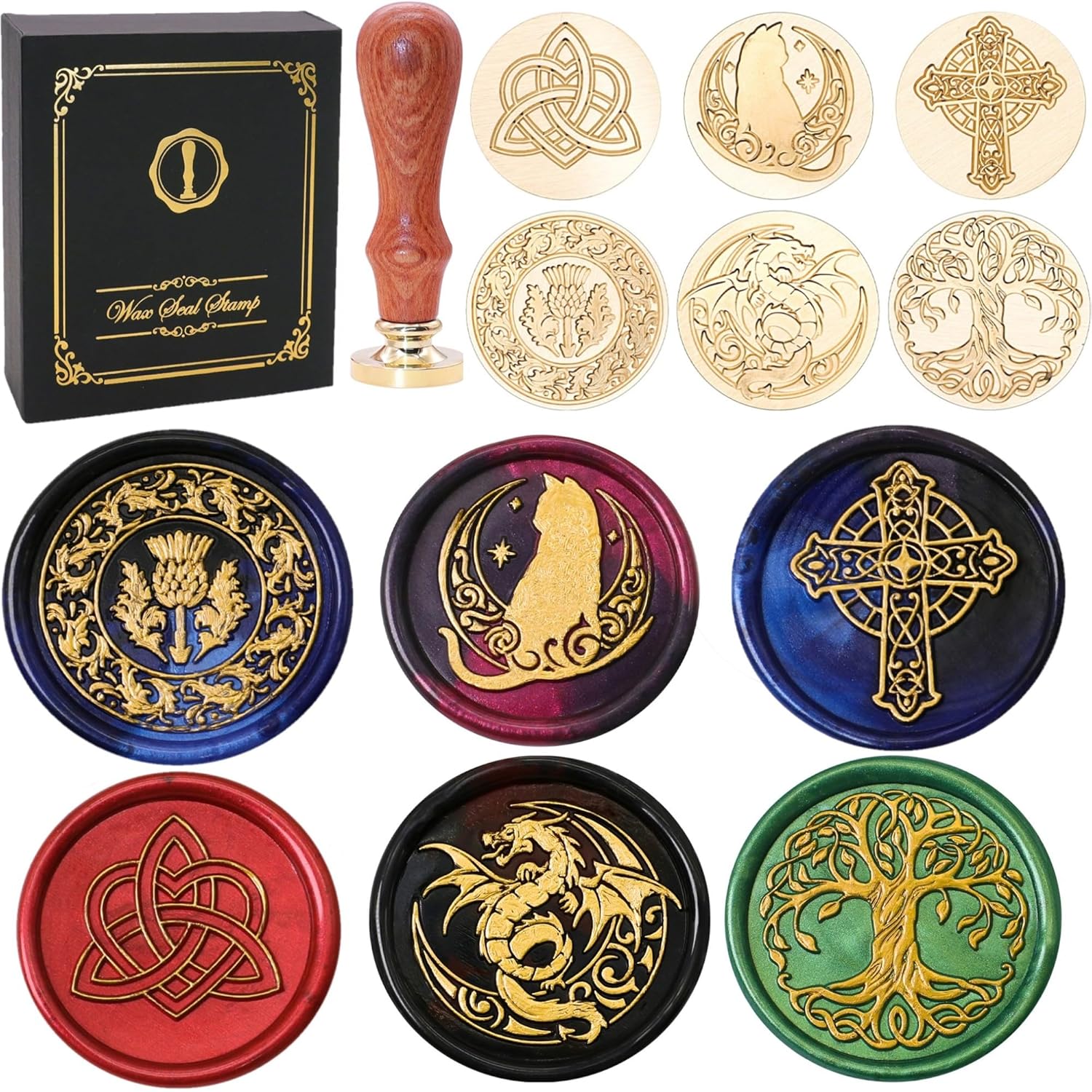 - Celtic Wax Seal Stamp Gift Box Set: You will get 6 wax seal stamp heads with different designs (scottish thistle, celtic dragon, celtic tree of life, love celtic knot, celtic cross, celtic moon with cat), 1 x wooden handle and 1 x exquisite gift box (not included sealing wax).