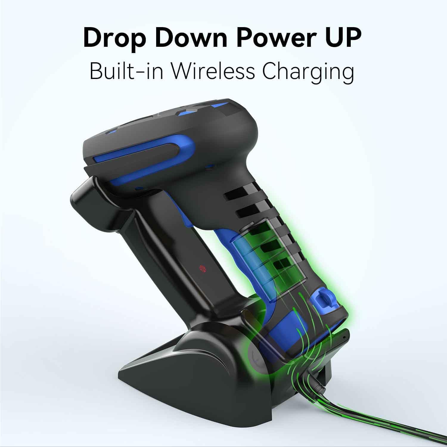 Alacrity Upgraded 2D Industrial Barcode Scanner with Wireless Charging Stand, 1968 Feet Transmission Distance 433Mhz Wireless & Bluetooth 2in1 Barcode Reader, Shock Dust Proof Hands Free, Blue