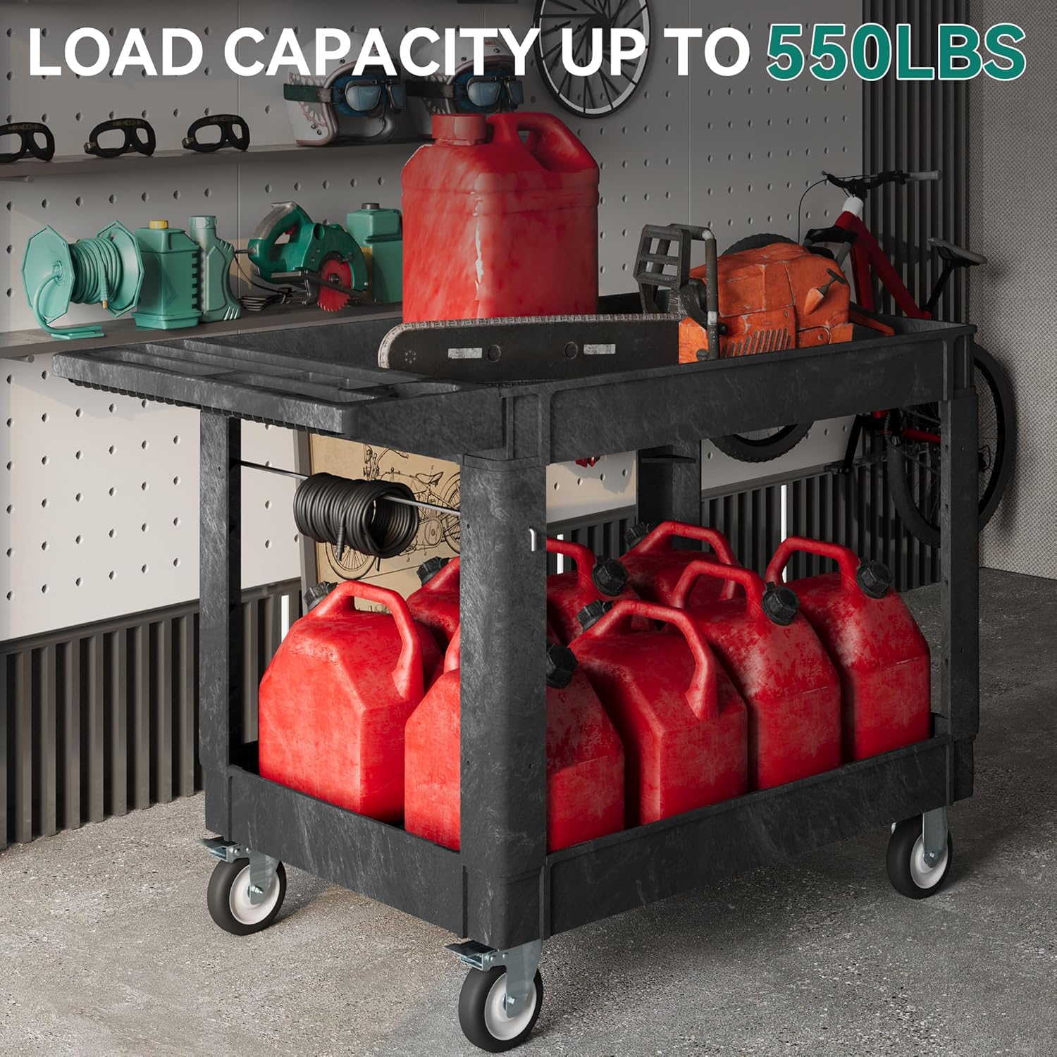 - 3-STEPS INSTALLATION: The package comes with professional installation instructions, you don't have to worry about the installation at all.Utility carts with wheels size description: 45x25x33.3 inches, Load Capacity: 550 lbs, Number of Layers: 2 layers. With this extra large heavy duty work cart, you can store more and push it easily.
