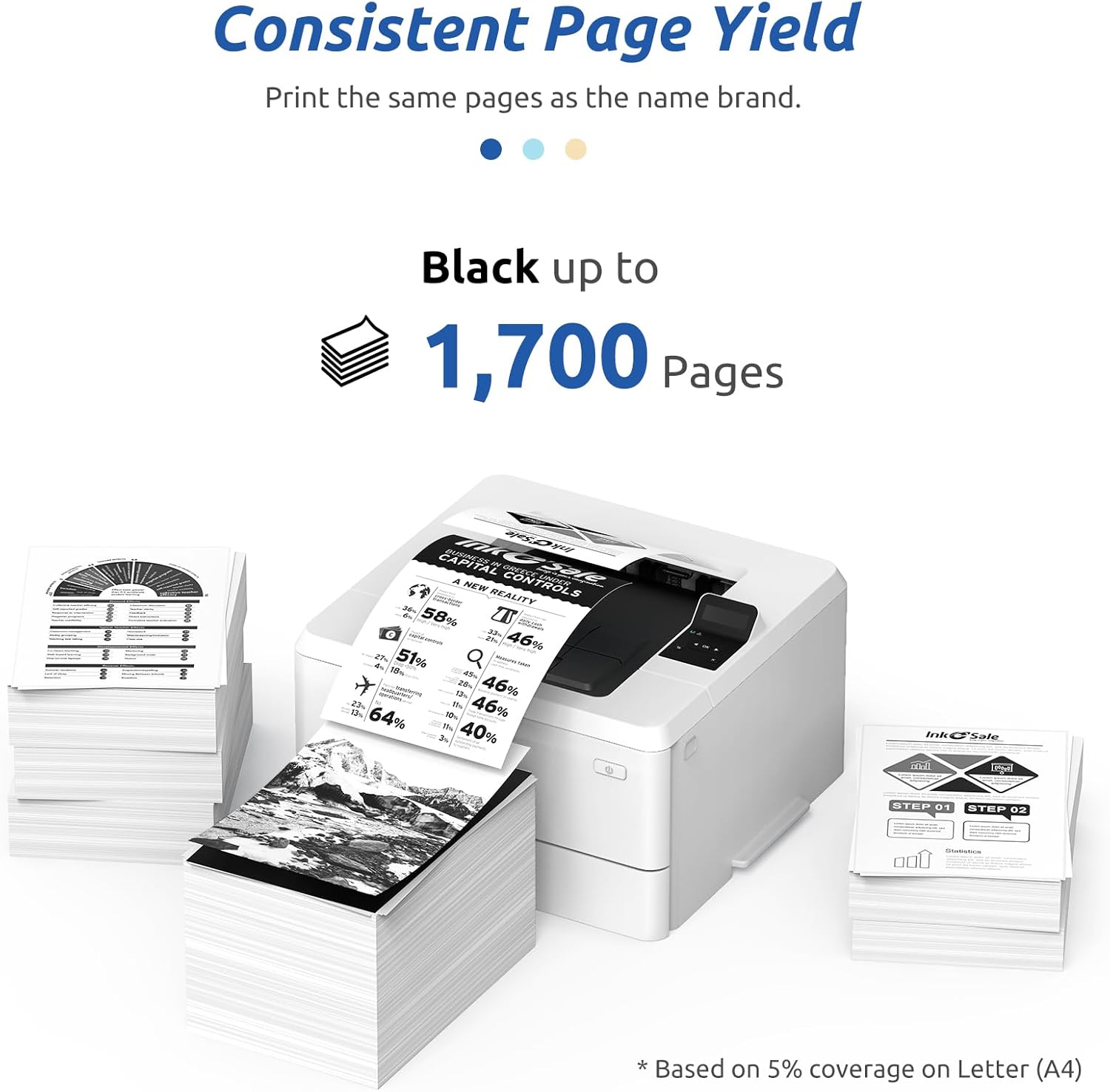- Estimated page yield: 1,700 pages per toner cartridge at 5% coverage (Letter/A4)
