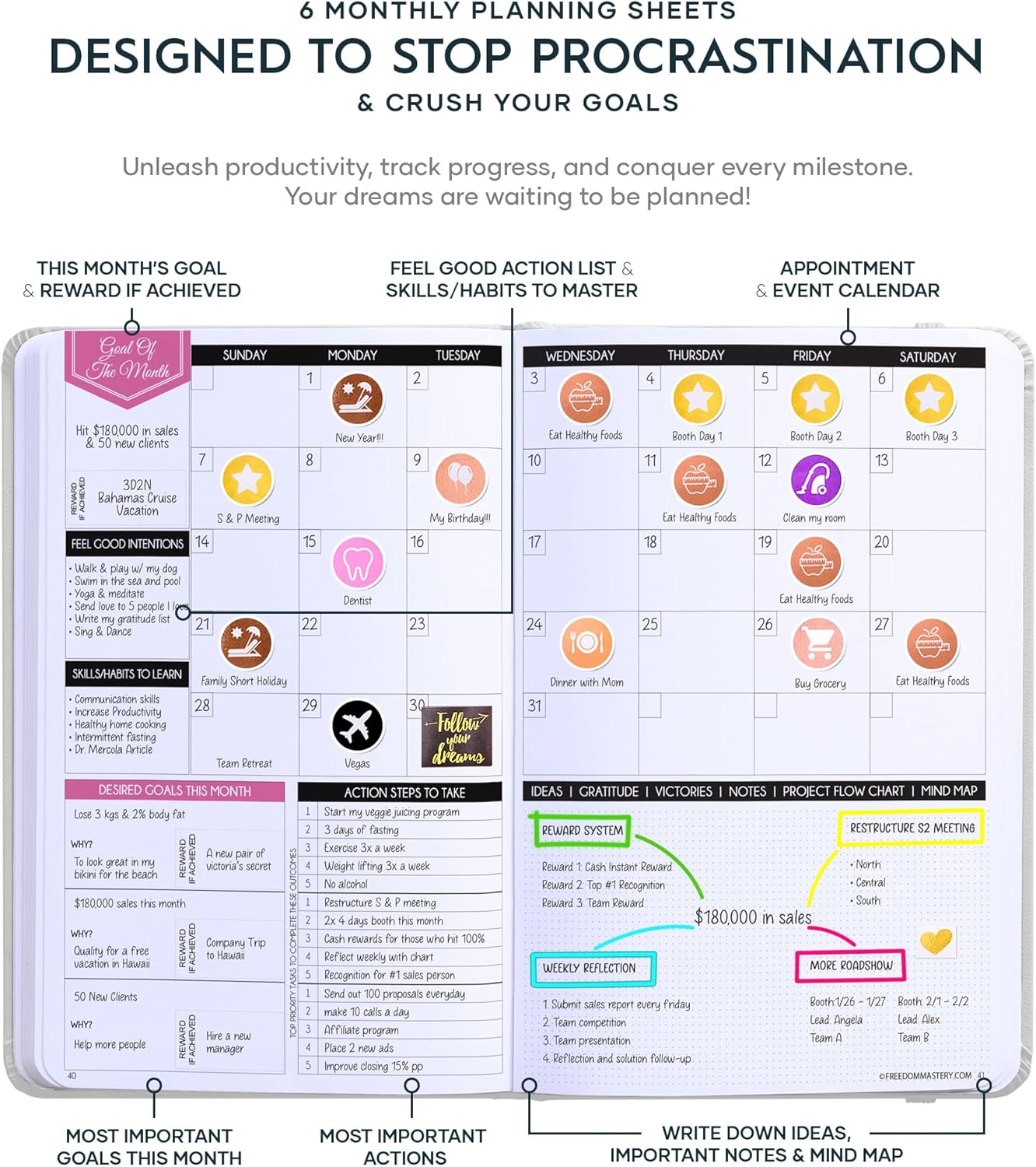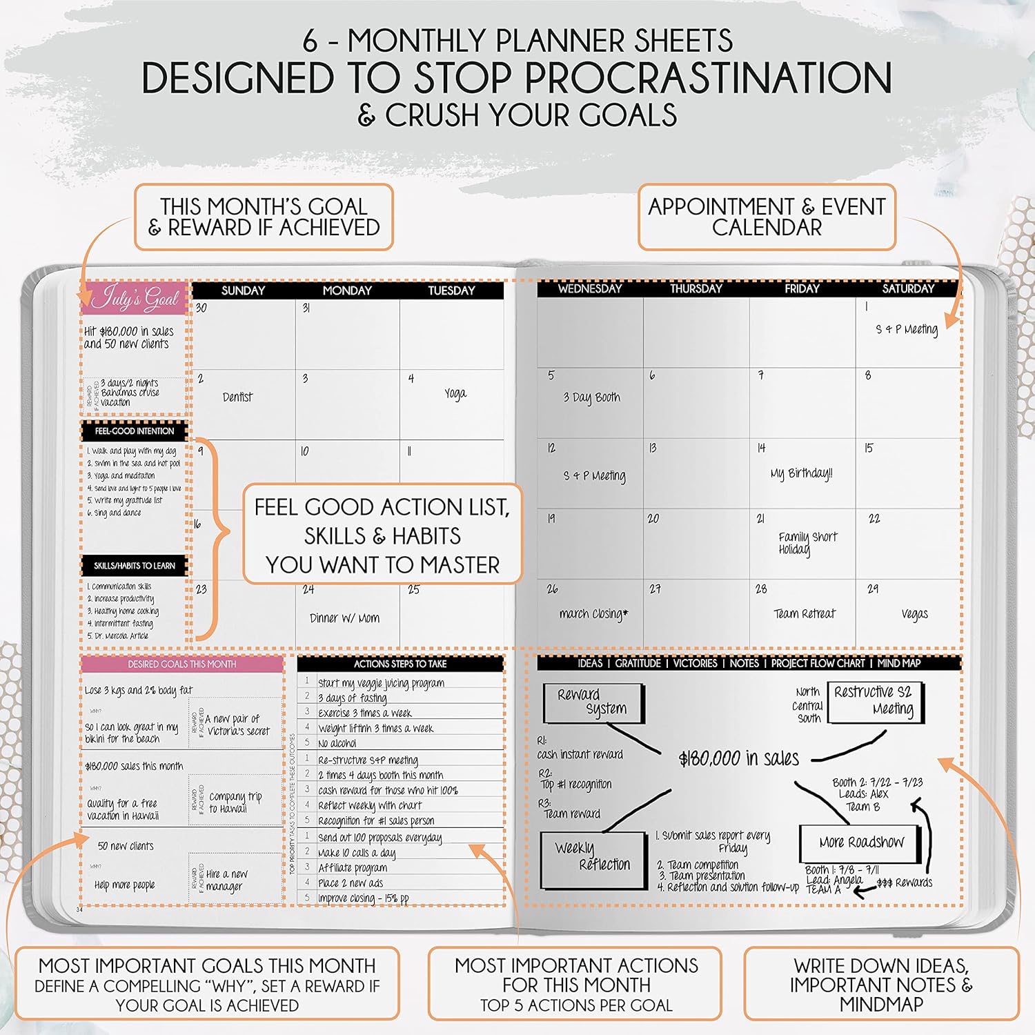 - SELF-CARE JOURNAL - This deluxe daily planner and gratitude journal comes in A5 size (5.8 x 8.3 inches). The life planner comprises 264 pages of thick 100 gsm paper, including 90 daily planning sheets, guiding you on how to become the best possible version of yourself on a mental, physical, and interpersonal level. It's a unique diary based on leading scientific studies proven to increase productivity and happiness. The journal features an out-foldable vision board to help you stay focused, morning and evening power questions, mind maps, reflection pages, habit trackers, a back pocket, and much more than any other planner on the market!