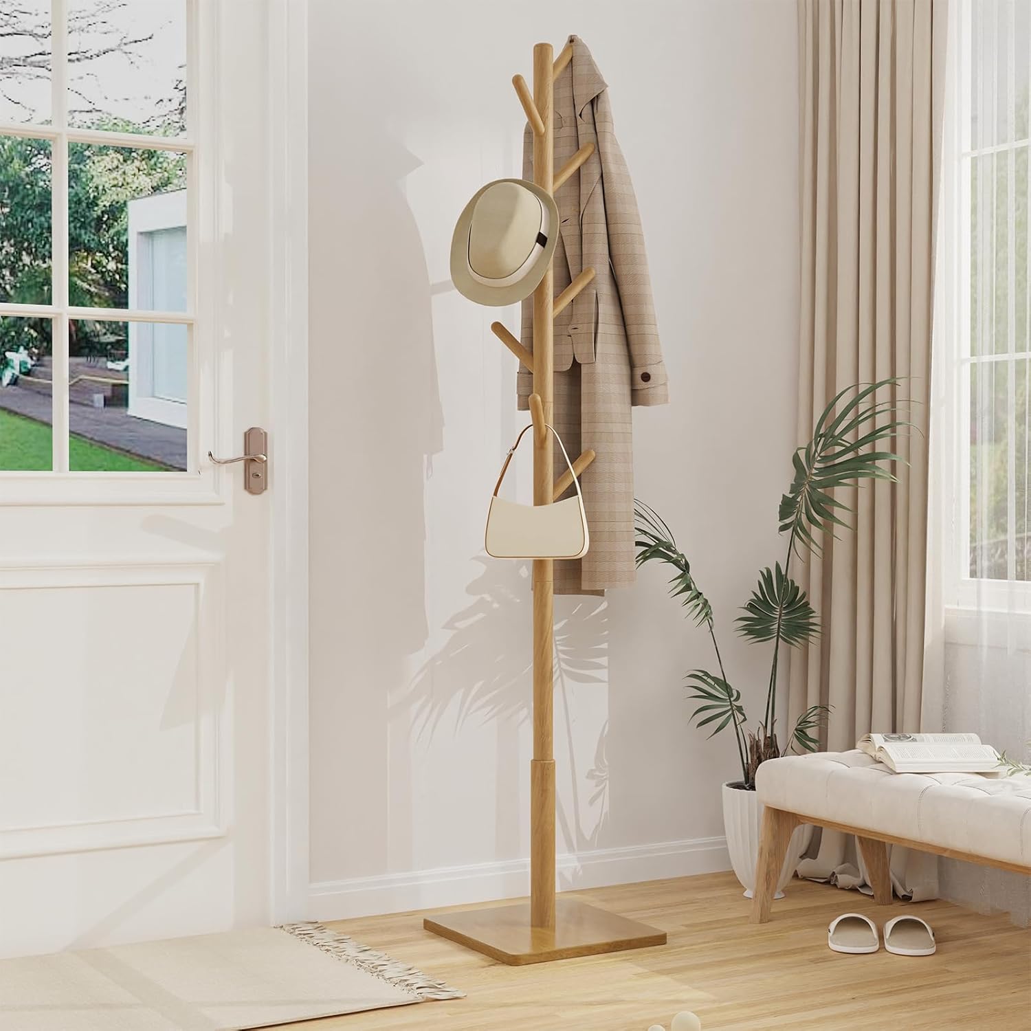 - Solid Like a Tree: Crafted of solid rubberwood, this coat rack is robust like a tree with its large square base, thick trunk for strong support, and rounded branches to hold up, offering a stable home for your clothes and hats