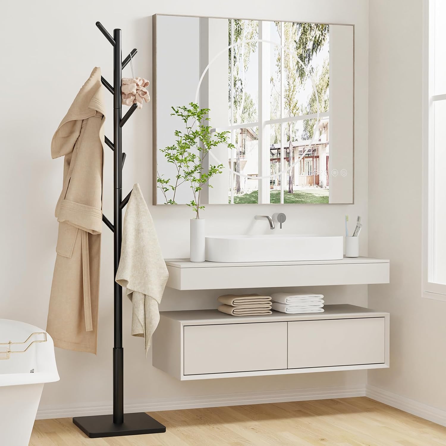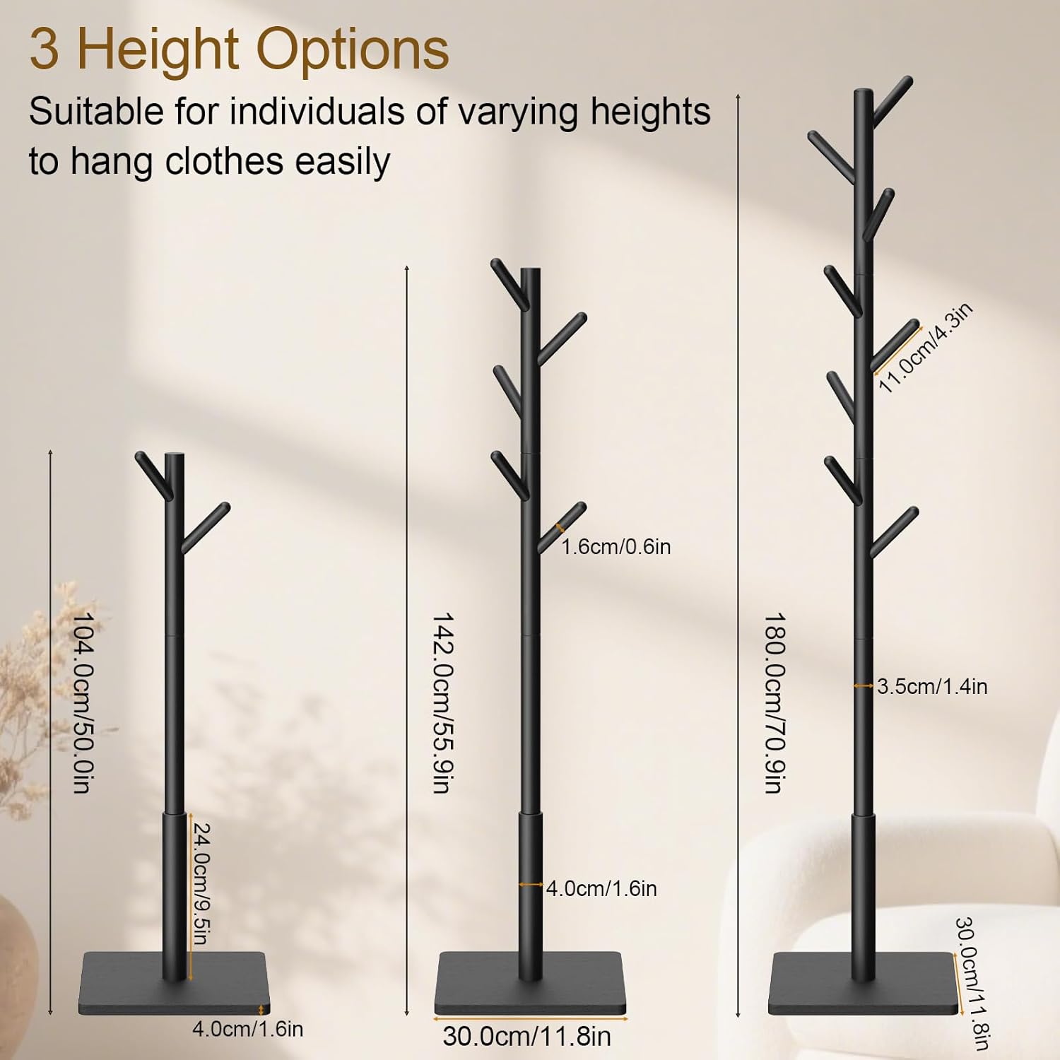 Coat Rack Freestanding with Stable Square Base for Cloathes, Hat, Used in Bedroom, Office and Entryway, Sturdy and Easy Assembly Coat Tree with 3 Adjustable Sizes and 8 Hooks, Black