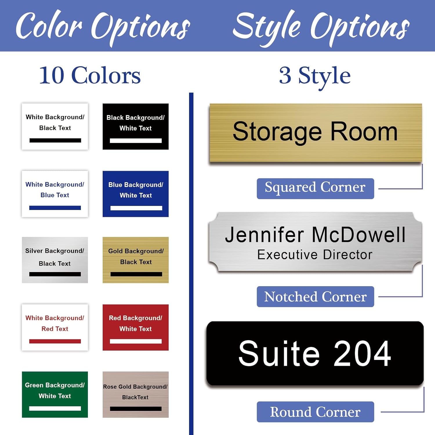 - UNIQUE DESIGN-The custom office door name plate design in 3 styles (Notched Corner, Round Corners, Squared Corner). 10 colors available. Size is 2"H x 8"L.
