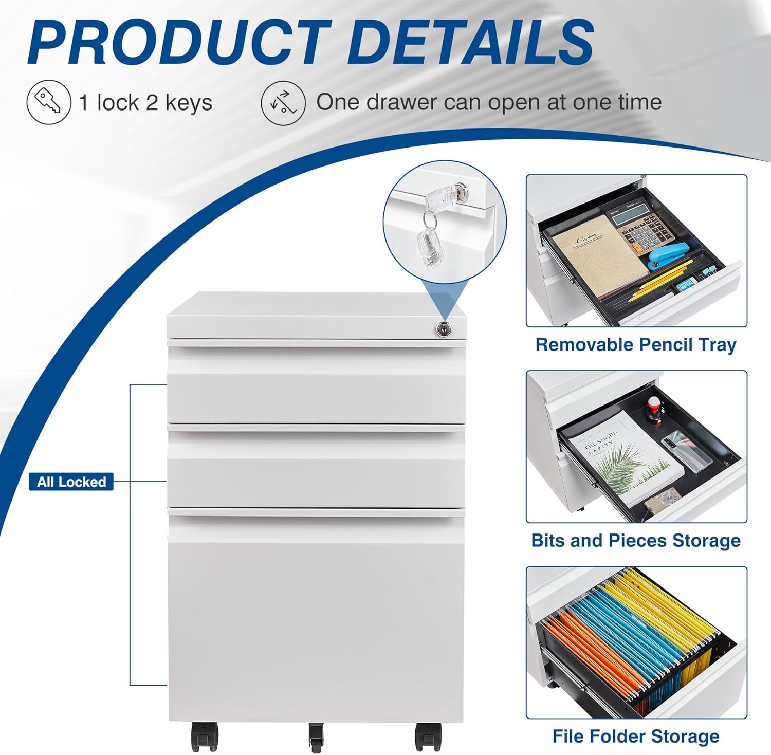 3 Drawer Vertical File Cabinet, Mobile Filling Cabinet with Lock for Legal/Letter Size, Pre-Built Office Storage File Cabinet with Wheels Under Desk - Fully Assembled