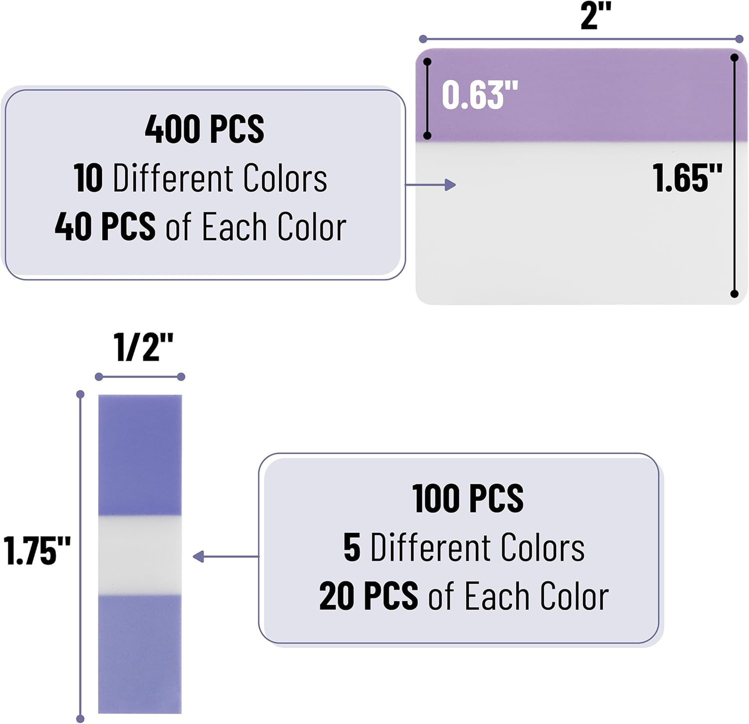- Package includes 500 pieces of sticky tabs in 21 sets, 400 pieces of 2-inch tabs in 20 sets with 10 different colors, and 100 pieces of 0.5-inch tabs in 1 set with 20 pieces of each color.