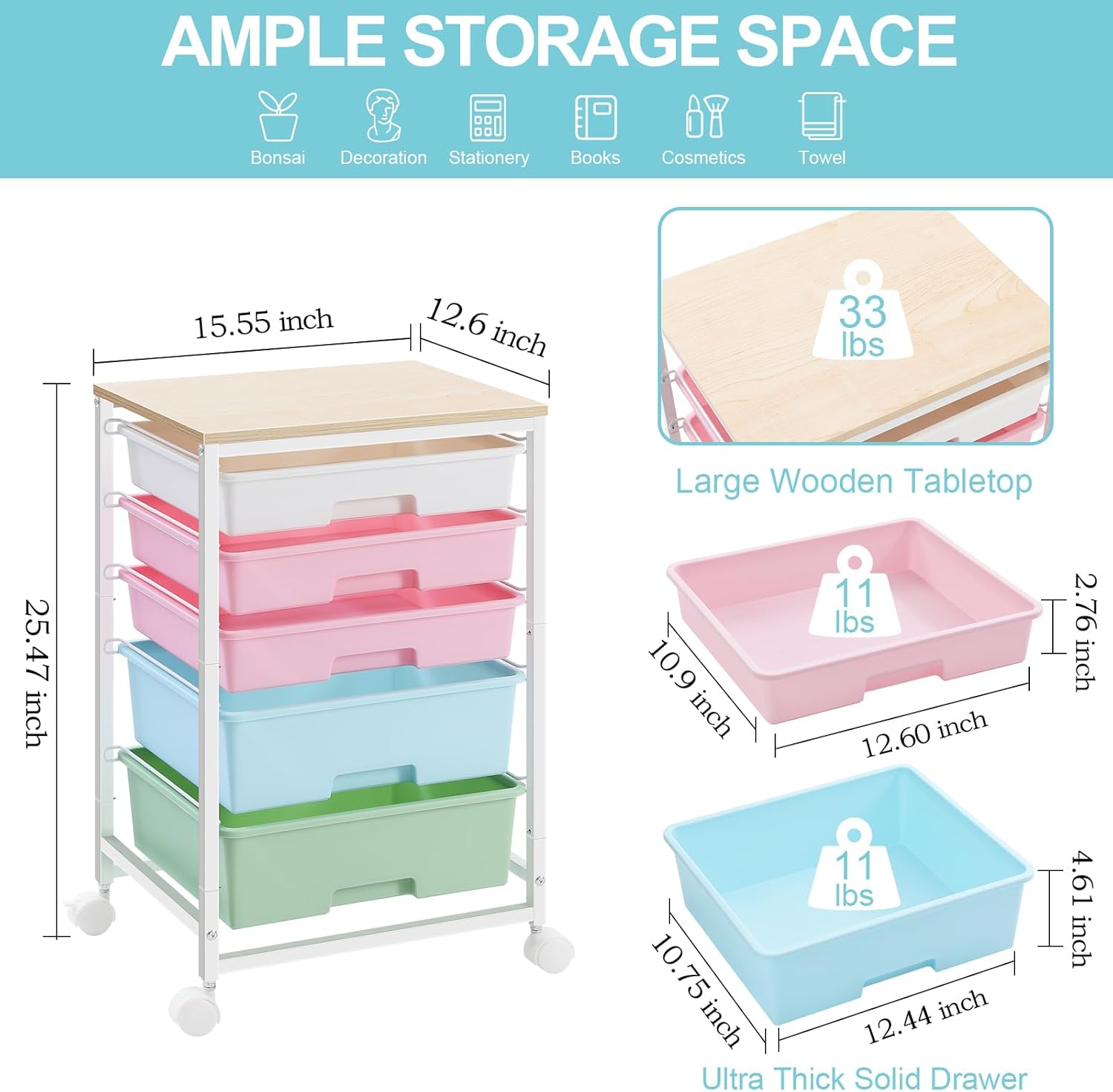 - WOODEN TABLETOP & THICK DRAWERS & METAL FRAME: The utility cart with drawer boasts a sturdy and durable powder-coated steel frame with water and rust resistance ensures a sturdy construction and built to last.Additionally, the slide-out drawers are made of durable PP material, which also boasts great durability.Holds 33 pounds on tits op plate and 11 pounds per drawer. This 5 drawer rolling cart will serve you for a long time.