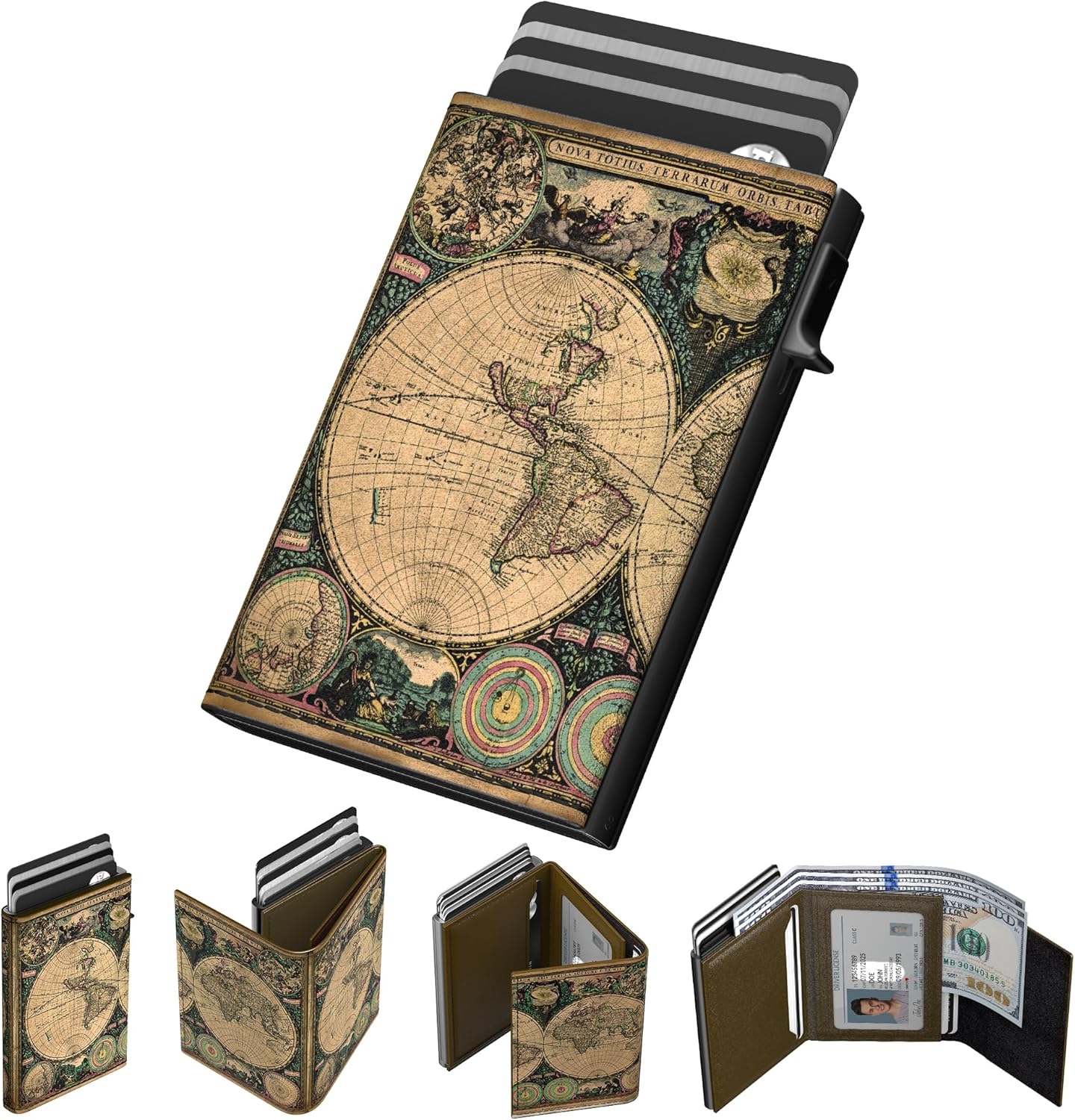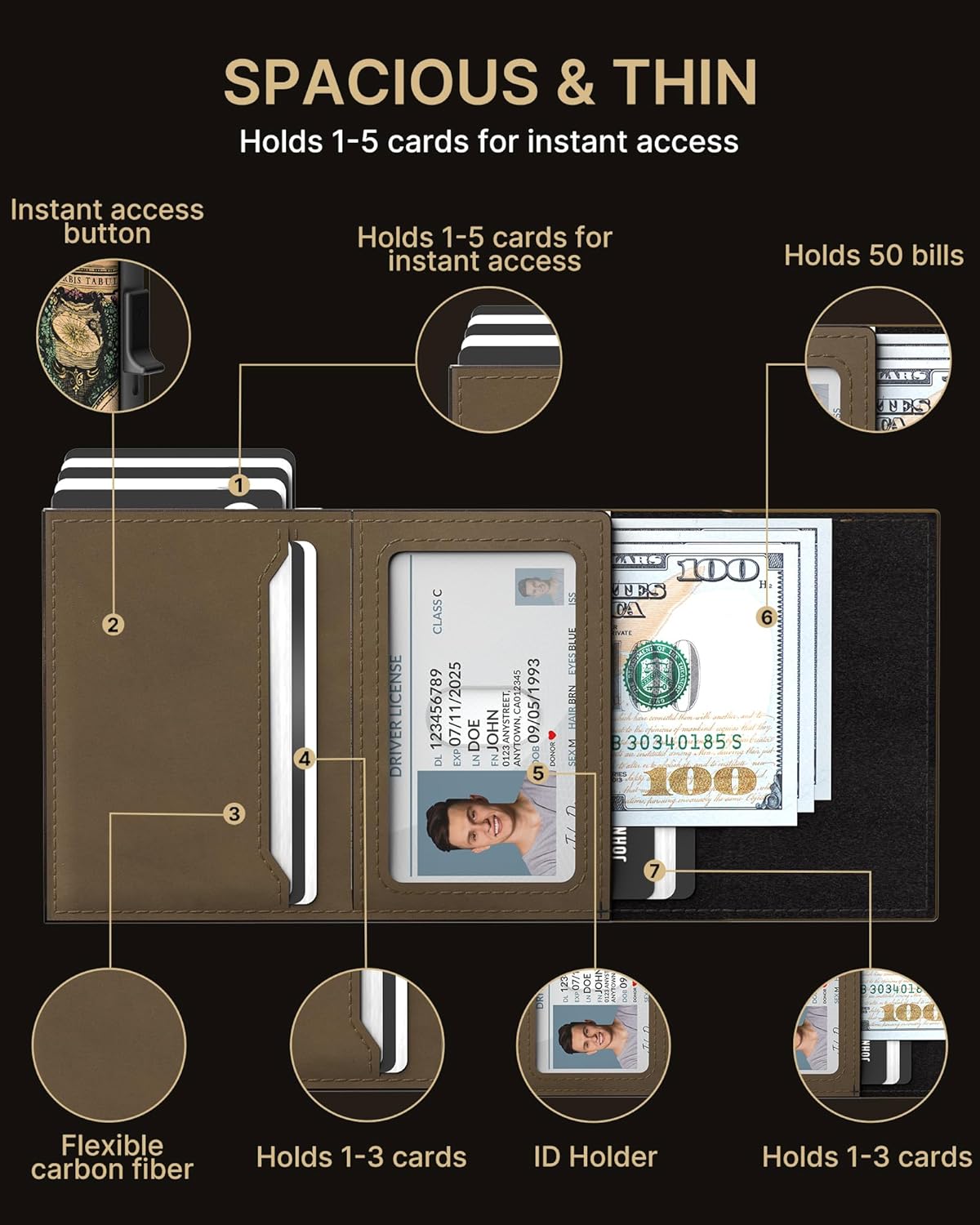 - 【QUICKEST ACCESS】Instant card access at the tap of a button by a single hand. Stores 10-15 cards and 15 bills total. The pop-up aluminum card holder stores 6-7, the built-in cash slot stores 50+ bills, and the ID window for driver's licenses.