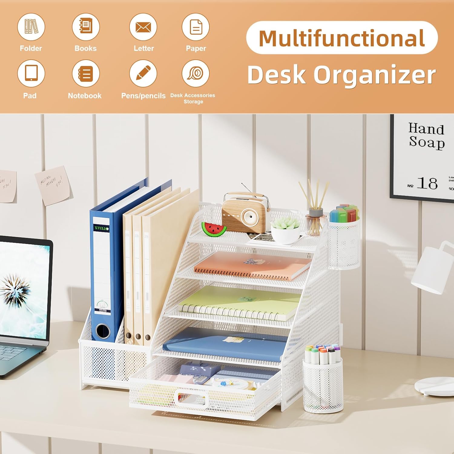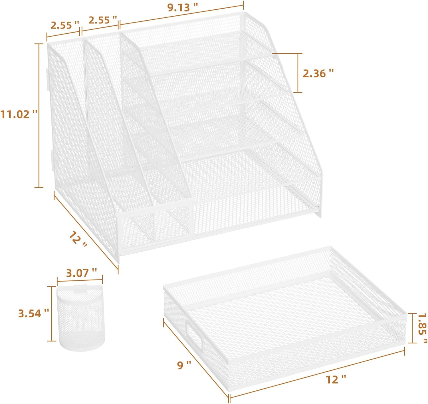 - 📂【Large Capacity】The desk organizer maximizes both the storage area and your desk's available space. For your notebooks, magazines, letters, and A4 paper, the ladder paper tray organizer would provide ample space. If you have documents and folders to store, consider using the vertical file holder to keep your office documents in order. The drawer organizer and hanging pen holder are enough to accommodate all office supply accessories and so on. Perfect Size:14.4*11*12inch.